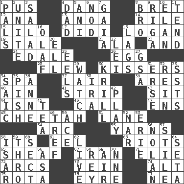 ACROSS 1. Festering 4. Mild oath, euphamism for damn 8. Cy Young winner Saberhagen 12. Santa ___, CA 13. Small Philippine buffalo 14. Cause heat under the collar 15. _ and Stitch 17. "You Light Up My Life" star Conn 18. Utah city north of Ogden 19. Having lost freshness 21. According to 23. Also 24. Peak District village in England 26. Oval reproductive body of a fowl 28. Soared 30. Smoochers 34. Health resort 37. Den 39. Ancient Greek god of war 40. The 18th letter of the Arabic alphabet 41. Empty completely 43. Be seated 44. Is not 46. Give a ring to 47. Followers of ems 48. Leopard's kin 51. Unable to walk 54. Curve 55. Tall tales 58. ___ a Wonderful Life 61. Snakelike fish 63. Disturbances 65. Bundle of cut stalks of grain 67. SW Asia republic 71. Writer Wiesel 72. Curves 73. Distinctive style or manner 74. The first octave above the treble staff 75. Round or rotation of duties 76. Jane of fiction 77. Teachers' org. DOWN 1. Friends 2. Join together 3. First course 4. Male parent 5. Black tropical American cuckoo 6. Allow head to fall sleepily 7. Greek goddess of the earth (variant) 8. Sis' sibling 9. Capital of Latvia 10. Liveliness 11. Be inclined (to) 16. Norwegian king 18. Fails to keep up a pace 20. Pipe bend 22. Luau accessory 25. Snakelike fish 27. Girls' org. (abbr.) 29. Timepiece 30. The principal food of baleen whales 31. Celtic language 32. It's straight from the horse's mouth 33. Fast planes 34. Ketch in the Levant 35. Expression of disdain 36. Singer Murray 38. Lyricist Gershwin 42. Romp 45. Beverage made from leaves 49. Unclean, religiously 50. Adept person 52. Spoil 53. 4th largest of the Great Lakes 56. Pitcher Ryan 57. Vertical member of a panel or frame 58. Austrian river, tributary to the Danube 59. Through, poetically 60. Religious group 62. Moving, as bait 64. Bristle 66. White ___ sheet 68. Marina Del _, California 69. Wind 70. Compass dir.