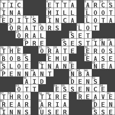 ACROSS 1. Nervous spasm 4. Singer James 8. Curves 12. _ tizzy (2 wds.) 13. Place where flour is made 14. Spoils 15. Prepares for publication 18. South American Indian 19. Globular water bottle used in Asia 20. Speakers 22. Car dealer's back yard 23. Relating to the mouth 24. Put into a specified state 25. Before (prefix) 26. French poetic form 30. Definite Article 33. Speak pompously 36. Greek god of love 37. Moves up and down 39. Australian flightless bird 40. Relaxation 41. A type of plum 42. Empty; void 44. Teachers' org. 45. Pre-World Series prize 47. Basketball assoc. 50. Assist 51. Cub Scout units 53. Baseball player Mel 54. Substance 57. Through, poetically 59. Become fatigued 61. Rob, plunder, or pillage 63. Hitchcock's "____ Window" 64. Operatic vocal solo 65. Lair 66. Lodging establishments 67. One who makes use of a thing 68. Compass dir. DOWN 1. Standoff 2. Southeast Asian peninsula 3. Capital of Egypt 4. Independent ruler or chieftain 5. Metal containers 6. Affectionate concern, for short 7. In the manner of 8. One to whom something is allotted 9. Carrot, for example 10. Small bed 11. R.R. building 16. Canvas cover 17. Play the lead 21. Margarine 22. French article 24. Observe 26. Make senseless or dizzy 27. SW Asia republic 28. Sense of smell 29. At sea 30. Cook's measure (abbr.) 31. Opening into or through something 32. Inky black, to poets 34. Monthly bill 35. Nanny (var.) 38. Elected representatives 42. Working for oneself (abbr.) 43. Conclusions 46. Small island 48. Fermented drink made from hops 49. Queen of England 1702-14 52. Tons 53. NW Algerian seaport 54. 4th largest of the Great Lakes 55. Dry up 56. Nights before holidays 57. Three (prefix) 58. Layer 59. The 19th letter of the Greek alphabet 60. Big collection agency 62. Compass dir.