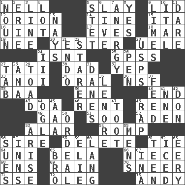 ACROSS 1. 1994 drama film starring Jodie Foster 5. Kill 9. Flaplike covering 12. Greek mythologigal hunter 14. Prong on a fork 15. Call ___ day 16. National forest in Provo, Utah 17. Nights before holidays 18. Third mo. 19. Born 20. Next before 23. Ubangi River tributary 24. Is not 25. Global Positioning Systems (abbr.) 27. Jacques of French films 30. Male parent 32. Slangy assent 33. Mine, in Marseilles 34. Of the mouth 36. Overdraft (abbr.) 38. Sound made by sheep 39. Compass dir. 40. Conclusion 43. ___ good deed 46. Monthly bill 48. Western Nevada city 49. E Mali city 51. "Barney Miller" actor Jack 52. An important port of Yemen 53. Having or resembling wings 54. Play 56. Beget 58. Erase 61. Standoff 64. Corn or form start 65. Actor Lugosi 66. Sibling's daughter 68. Followers of ems 69. Water falling in drops from the sky 70. Scornful expression 71. Compass dir. 72. Cassini of fashion 73. Actor Griffith DOWN 1. Part of speech 2. 4th largest of the Great Lakes 3. Actor's bit 4. Car dealer's back yard 5. Proofreading order 6. Moving, as bait 7. Disorder of the immune system 8. It is so 9. Citrus fruits 10. Slanted text style (abbr.) 11. Have the gumption 13. Negative votes 21. Inside; within (prefix) 22. A viewer who gazes fixedly 23. United States Postal Service (abbr.) 24. One more than two 26. Writing instrument 27. Bar bill 28. Wet nurse (var.) 29. Frog relative 31. Natives or inhabitants of Denmark 35. Poe poem 37. Nourish 41. Compass dir. 42. Spanish title 44. Stare at amorously 45. Auto club (abbr.) 47. A blast of a horn 48. Strike 50. Severe or trying experience 53. Ascend 55. Not women's 56. Takes to court 57. Taverns 59. Writer Wiesel 60. Austrian-born American filmmaker Fritz 61. Adolescent 62. On the rocks 63. Suggestive of the supernatural 65. Sis' sibling 67. _ tizzy (2 wds.)