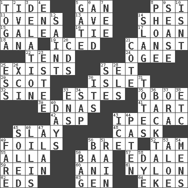 ACROSS 1. Periodic rise and fall of the sea level 5. Separate the seeds from cotton 8. 23rd letter of the Greek alphabet 11. Baking chambers 13. "___ Maria" 14. "______ My Girl" (Turtles hit) 15. An organ shaped like a helmet 16. Make a knot 17. Grant temporary use of 18. Santa ___, CA 19. On the rocks 21. 2nd pers. sing. pres. of can (arch.) 22. Look after 24. Double curve, resembling the letter S 25. Is 27. Arrange properly for use 29. Highlander 30. Small island 32. Trig term 33. _____ Park, CO 35. Mitch Miller's instrument 39. Ferber et al. 41. Small pie 42. Cleo's killer 43. Medicinal drug used to evoke vomiting 45. Kill 48. Keg 49. Fencing necessities 50. Cy Young winner Saberhagen 52. Scottish cap 55. Silent film actress Nazimova 56. Sound made by sheep 57. Peak District village in England 59. It's straight from the horse's mouth 60. Black tropical American cuckoo 61. Thermoplastic polyamide 62. Begley and Asner 63. Commissioned mil. rank 64. Makes supply last DOWN 1. Ancient Roman robe 2. "Terrible" tsar 3. Accusation by an informer 4. Compass dir. 5. Yard entry 6. Enthusiastic 7. Born 8. Give a jingle 9. Gospel singer Marvin 10. Is not 12. Virtuous person 14. Volcanic refuse 20. Music discs 21. ____ d'Azur (French Riviera) 23. First name in cosmetics 25. Double-curved letter 26. One more than ninety 27. Compass dir. 28. Raised railways 30. ___ a Wonderful Life 31. Lugs 33. Followers of ems 34. Plant excrement 36. Sass 37. Mouth or opening 38. And so on (abbr.) 40. 24-hour periods 43. Frozen water 44. Eucharist need 45. Having a sole or soles 46. Ms. Damita and namesakes 47. ____ Jay Lerner 49. Conductor's collection 50. Object of repulsion 51. Water falling in drops from the sky 53. Medicinal plant 54. Not women's 56. Paper or plastic container 58. Color