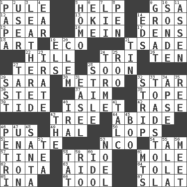 ACROSS 1. Whimper 5. Assist 9. Girls' org. (abbr.) 12. Toward the sea 13. Migrant worker of the '30s 14. Greek god of love 15. Lightbulb-shaped fruit 16. Chow _ 17. Cub Scout units 18. Tate display 19. Environmental prefix 21. Sadhe (variant) 22. Land elevation 24. Three (prefix) 26. "___ Little Indians" 27. Laconic 28. Within a short period 29. "Two Mules for Sister ____" 30. Paris' subway 32. Play the lead 36. Proofreading order 37. Direct toward a target or goal 38. Drink excessively 39. Event that recurs at intervals 40. Small island 42. Raze (variant) 43. Family _ (genealogy) 44. Stay 46. Purulenc 49. Actor Linden 50. Chops off 51. Maternal 53. Non-commissioned officer (abbr.) 54. Scottish cap 57. Prong on a fork 58. Musical group of three 61. Undercover agent 62. Round or rotation of duties 63. Helper 64. Lacquered or enameled metalware 65. _ tizzy (2 wds.) 66. Implement 67. Narrow board DOWN 1. Dad 2. One who uses or employs something 3. Tough but pliablecoriaceous 4. Ewer handle 5. Same (prefix) 6. Supplement with great effort 7. Cards in a Roman deck? 8. Fenced enclosure 9. Relatively large 10. Message 11. NE Netherlands city 14. Begley and Asner 19. Raised railways 20. Clement's nick name 21. Metal container 23. Feeling or showing extreme anger 24. Singer Mel 25. Friend of Pooh 27. Jacques of French films 28. Vertical member of a panel or frame 29. Fast jet (abbr.) 31. Artist's stand 32. Long narrow piece of something 33. Inedible or poisonous agaric 34. Domed church section 35. To separate or throw off 40. Retirement account (abbr.) 41. Baby powder 43. Definite Article 45. Surprise greeting 46. _ dish (used to culture cells) 47. The state of being joined or united 48. Before Barbara or Clara 52. Beverage made from leaves 53. Christmas carol 55. Silent film actress Nazimova 56. Confront 58. Make lace 59. _ de Janeiro 60. Wedding promise 61. Mountains (abbr.)