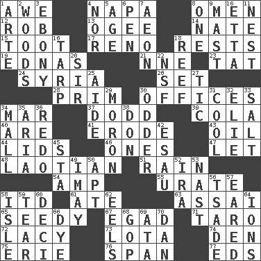 ACROSS 1. Deep reverence 4. California wine valley 8. Presage 12. Director Reiner 13. Double curve, resembling the letter S 14. Nathan's nickname 15. A blast of a horn 17. Western Nevada city 18. Musical pauses 19. Ferber et al. 21. Compass dir. 23. Make lace 24. Damascus' land 26. Put into a specified state 28. Demure 30. Places of business 34. Third mo. 37. Texas town _ City 39. Root beer relative 40. "We ___ not amused" (Victoria) 41. Wear away 43. Petroleum 44. Hats (slang) 46. Singles 47. Allow 48. Of or relating to Laos or its people 51. Precipitation 54. Electrical Unit 55. A salt of uric acid 58. It would 61. Had dinner 63. Slender Brazilian palm 65. Morally degraded 67. Mild oath 71. Pacific island yam 72. Made of lace 73. Globular water bottle used in Asia 74. Lair 75. 4th largest of the Great Lakes 76. Connect, as a bridge 77. Begley and Asner DOWN 1. Johnson of "Laugh-In" 2. Forest 3. Black 4. Not either 5. Grow older 6. Writing instrument 7. Period of immesurable duration 8. Single 9. Vertical spar for supporting sails 10. Singer James 11. A home for chicks 16. Canvas cover 18. Coral ridge 20. Title for a knight 22. Overdraft (abbr.) 25. Helper 27. Nervous spasm 29. Person of subnormal intelligence 30. More peculiar 31. Calm and collected 32. Writer Wiesel 33. Table seasoning 34. Shopping center 35. Roberta Peters solo 36. Redecorate 38. Spanish title 42. He sold his birthright 45. R.R. building 49. "If ____ say so..." 50. Fitting 52. Retirement account (abbr.) 53. Political cartoonist Thomas 56. Sadhe (variant) 57. Having ears or earlike features 58. Small island 59. Pull into pieces 60. Tenth: prefix 62. Snakelike fish 64. Charged particles 66. Color 68. Grand Old Party 69. "One Day ___ Time" 70. One of the 12 tribes of Israel