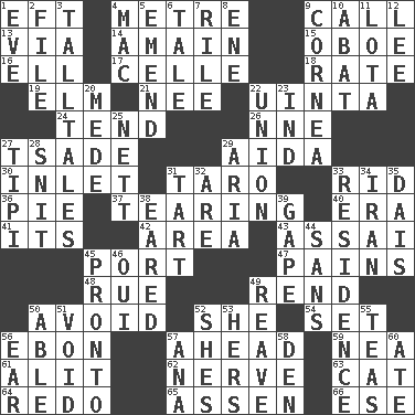 ACROSS 1. Newt 4. Distance measurement (Brit.) 9. Give a ring to 13. By way of 14. At full speed 15. Mitch Miller's instrument 16. Pipe bend 17. Cell (Danish) 18. Pace 19. Shade tree 21. Born 22. National forest in Provo, Utah 24. Look after 26. Compass dir. 27. Sadhe (variant) 29. Opera by Verdi 30. An arm off of a larger body of water 31. Pacific island yam 33. To free from 36. Sliced dessert 37. Separating forcefully 40. Period 41. It is 42. Type of rug 43. Slender Brazilian palm 45. Sweet dark-red dessert wine 47. Aches 48. Regret 49. Tear apart 50. Keep away from 52. A female animal or person 54. Arrange properly for use 56. Inky black, to poets 57. At or in the front 59. Teachers' org. 61. Came down and settled, as after flight 62. Boldness 63. Feline 64. Make new 65. NE Netherlands city 66. Compass dir. DOWN 1. Night before a holiday 2. Do some clerical work 3. Baron Munchausen's specialties 4. Big _ 5. Make improvements or corrections to 6. Story 7. Cause heat under the collar 8. Compass dir. 9. Pupil covering 10. Blind as ____ 11. Globular water bottle used in Asia 12. Area sheltered from the wind 20. Ancient Persian 22. The state of being joined or united 23. Indiana (abbr.) 25. Remaining after all deductions 27. Native american tent (variation) 28. In a ____ (agitated or irritated) 29. Roberta Peters solo 31. Small pie 32. "We ___ not amused" (Victoria) 33. Dwelling 34. SW Asia republic 35. Raised platform 38. Having ears or earlike features 39. Open wide 44. Without 45. Right away 46. Fr. "Yes" 49. Rob, plunder, or pillage 50. Competent 51. Lacking any legal or binding force 52. "______ My Girl" (Turtles hit) 53. Possessive pronoun 55. Beverages made from leaves 56. Ewer handle 57. Santa ___, CA 58. Lair 60. Had dinner