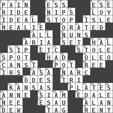 ACROSS 1. Ache 5. Curvy letter 8. Compass dir. 11. Travel on or in a vehicle 12. Cuts off 14. Myrna of the movies 15. Standard of perfection 17. Discontinue 18. Small island 19. Ear of corn 21. Declaimed 23. Everything 25. Religious women 26. Roberta Peters solo 27. Put into a specified state 28. Actor Linden 31. Small drink 33. And so on (abbr.) 35. Took without asking 37. Specific locale 38. Possessed 40. Butter sub 41. 2nd pers. sing. pres. of can (arch.) 43. Plant holder 45. To sift 46. Big collection agency 47. White ___ sheet 50. Drug cop 52. Lyric poems 53. Three (prefix) 54. Sunflower state 56. Food holders 61. Queen of England 1702-14 62. Thailand, formerly 65. Peak District village in England 66. Born 67. Son of Isaac 68. Actor Alda or Thicke 69. Morning condensation 70. Label 71. Monthly bill DOWN 1. Demure 2. Assistant 3. The main thing one is thinking about 4. Be tempered by heat 5. Followers of ems 6. Be seated 7. Soup utensils 8. Otherwise 9. Disposed of to a purchaser 10. Sight organ 13. Upset 16. One who doesn't tell the truth 18. ___ a Wonderful Life 20. Writer Wiesel 22. Pismires 24. Thin strip of wood or metal 26. Tenement units (abbr.) 28. Hollow 29. Toward shelter 30. Lion 31. Coast Guard woman 32. Charged atoms 34. Head covering 36. Torque (variant) 37. _-fi 39. Do not 42. Bits 44. Canvas cover 48. Gospel singer Marvin 49. Aid 51. Cause heat under the collar 52. Single 54. Leg joint 55. Afresh 57. The sixth month of the Jewish calendar 58. Falsehood 59. Flair 60. Posted 61. Added to 63. Auto club (abbr.) 64. Large cup