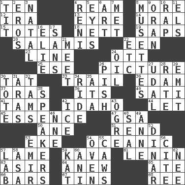 ACROSS 1. "___ Little Indians" 4. 480, 500 or 516 sheets of paper 8. Greater amount 12. Lyricist Gershwin 13. Jane of fiction 14. Mountain range 15. Lugs 18. Remaining after all deductions 19. Plant excrements 20. Deli grouping 22. Car or cant ending 23. Actor's bit 24. Baseball player Mel 25. Compass dir. 26. Photo 30. Make lace 33. Drop behind 36. Dutch treat 37. Mouths or openings 39. It is 40. Suttee (variant) 41. Pack (down) 42. Potato state 44. Allow 45. Substance 47. Girls' org. (abbr.) 50. One (Scot) 51. Tear apart 53. Make supply last 54. Pertaining to the sea 57. Unable to walk 59. Polynesian shrub of the pepper family 61. Soviet premier 1918-24 63. SW Saudi Arabia district 64. Afresh 65. Had dinner 66. Oblong pieces of solid material 67. Airtight sealed metal containers 68. Portuguese money of account (variant) DOWN 1. Teat (slang) 2. Greek god of love 3. Relating to or accompanying birth 4. Painter Guido (1575-1642) 5. Snake ____ (dice throw) 6. Nonscientific branch of learning 7. Was introduced to 8. French bagpipes 9. NW Algerian seaport 10. Reproach for some lapse or misdeed 11. Raised railways 16. Writer Wiesel 17. Without 21. Rendezvous 22. And so on (abbr.) 24. Petroleum 26. Expression of disdain 27. Freehold land 28. Pace 29. Send forth 30. Carry 31. Caspian sea tributary 32. Scottish caps 34. Travel on an animal 35. "One Day ___ Time" 38. Orators 42. Frozen water 43. Legendary monster 46. Compass dir. 48. Lick closed 49. Singer Murray 52. Middle Eastern gold or silver currency 53. Independent ruler or chieftain 54. Baking chamber 55. Crow sounds 56. Quote 57. Experiment locale 58. White ___ sheet 59. Krazy ___ of comics 60. Cuckoo 62. Born