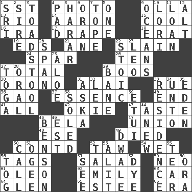 ACROSS 1. Fast jet (abbr.) 4. Picture 9. Rounded earthenware pot or jar 13. River (Sp.) 14. Composer Copland 15. Calm and collected 16. Lyricist Gershwin 17. Window treatment 18. Part of Q.E.F. 19. Begley and Asner 21. A saturated hydrocarbon 22. Killed 24. Coast Guard woman 26. Nine, plus one 27. Add up to 29. Scornful sounds 30. U. of Maine site 31. Jai ____ 33. Regret 36. E Mali city 37. Center 40. Conclude 41. 100% 42. Migrant worker of the '30s 43. Clothes sense 45. Actor Lugosi 47. The state of being joined or united 48. Compass dir. 49. Passed on 50. Continued (abbr.) 52. The 23rd letter of the Hebrew alphabet 54. Soggy 56. Labels 57. First course 59. Modern: prefix 61. Butter sub 62. Poet Dickinson 63. Automobile 64. Small, secluded valley 65. First name in cosmetics 66. Epoch DOWN 1. _ Lanka 2. Male parent of an animal 3. Inedible or poisonous agaric 4. Writing tablet 5. Ethiopian city, capital of Harari 6. NW Algerian seaport 7. Drink excessively 8. Single 9. Seas 10. Australian parrot (variant) 11. Grant temporary use of 12. Keyboard modifier key 20. Connect, as a bridge 22. Unemotional 23. Lion 25. Medicinal plant 27. Ancient Roman robe 28. Spoken 29. Object of repulsion 31. "____ silly question..." 32. Flowery wreath 33. Dwelling 34. To (old English) 35. Locale of original sin 38. Having a sole or soles 39. Needle case 44. Afresh 45. Gillaume's butler role 46. Eastern Standard Time (abbr.) 49. A sleeping potion; an opiate (poet.) 50. Give a ring to 51. Double curve, resembling the letter S 52. Scottish caps 53. Came down and settled, as after flight 55. Pull into pieces 56. Coat; cloak 57. Observe 58. Color 60. Mouth or opening