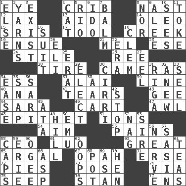 ACROSS 1. Sight organ 4. Baby bed with high sides 8. Political cartoonist Thomas 12. Not strict 13. Opera by Verdi 14. Margarine 15. Indian titles of respect 17. Implement 18. Small stream 19. Follow as a consequence or result 21. Cartoonist voice _ Blanc 23. Compass dir. 24. Vertical member of a panel or frame 26. To separate or throw off 28. Hoop that covers a wheel 30. Devices for capturing images 34. Curvy letter 37. Mountain range southwest of Kyrgyzstan 39. Actor's bit 40. Santa ___, CA 41. Separates forcefully 43. Unit of force equal to gravity 44. "Two Mules for Sister ____" 46. Heavy open wagon 47. Leather borer 48. Curse 51. Charged particles 54. Direct toward a target or goal 55. Aches 58. Corporate head (abbr.) 61. Nilotic language 63. Relatively large 65. Therefore, facetiously 67. Brightly colored fish 71. Celtic language 72. Sliced desserts 73. Airs 74. By way of 75. Ooze 76. Comedian Laurel of Laurel & Hardy 77. Followers of ems DOWN 1. Otherwise 2. Entertaining tales 3. Be 4. Domesticated feline 5. River (Sp.) 6. Wedding promise 7. Lip ointment 8. Or not 9. Toward shelter 10. Observes 11. Casino tip 16. Set of matching outer garments 18. Clement's nick name 20. Biblical high priest 22. Epoch 25. Part of Q.E.F. 27. Snakelike fish 29. Choose 30. High-altitude cloud 31. Port city in Latvia 32. Afresh 33. Stitch closed the eyes of (a falcon) 34. Relaxation 35. Fastener 36. Indian skirt 38. American Automobile Association (abbr.) 42. Cease 45. "One Day ___ Time" 49. Land elevation 50. Australian flightless bird 52. Tired old horse 53. Title for a man of rank and authority 56. Effrontery 57. Indian antelope 58. Balmoral and tarboosh 59. One of the Great Lakes 60. Double curve, resembling the letter S 62. I made a mistake 64. Afternoon social gatherings 66. Cleo's killer 68. Plant holder 69. White ___ sheet 70. Layer