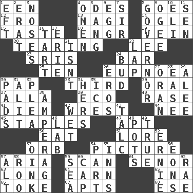 ACROSS 1. Car or cant ending 4. Lyric poems 8. Travels 12. Back 13. Wise men 14. Stare at amorously 15. Clothes sense 18. Engineer (abbr.) 19. Distinctive style or manner 20. Rending 22. Area sheltered from the wind 23. Indian titles of respect 24. Oblong piece of solid material 25. Nine, plus one 26. Normal relaxed breathing 30. Infant food 33. One of three equal parts 36. Taken by mouth 37. Silent film actress Nazimova 39. Environmental prefix 40. To erase 41. South Vietnam president (1954) 42. Obtain by seizing forcibly or violently 44. Born 45. Paper fasteners 47. Fitting 50. Ingest 51. Old wives' tales, e.g. 53. Globe 54. Photo 57. Roberta Peters solo 59. Examine minutely or intensely 61. Sir (Sp.) 63. Yearn 64. Merit 65. _ tizzy (2 wds.) 66. Casino tip 67. Flats, for short 68. Compass dir. DOWN 1. Lizard (obsolete) 2. Part of Q.E.F. 3. Olfactory organs 4. Sign of something about to happen 5. Mild oath, euphamism for damn 6. Oval reproductive body of a fowl 7. Title for a knight 8. State head 9. Double curve, resembling the letter S 10. Biblical high priest 11. Elected rep. 16. Small pie 17. 4th largest of the Great Lakes 21. Is not 22. Pet locale 24. Partially opened flower 26. Greek god of love 27. NW Algerian seaport 28. Comfort 29. Toward shelter 30. Writing tablets 31. Set down 32. Entreaty 34. Possessive pronoun 35. Frozen water 38. Electrical Measurement 42. Soggy 43. Baby powder 46. Experiment locale 48. Plant holders 49. Loyal 52. Bert's buddy 53. Pig sound 54. Component 55. Taverns 56. Immeasurably long periods of time 57. Keyboard modifier key 58. Friend of Pooh 59. Ocean 60. Head covering 62. Actress Charlotte