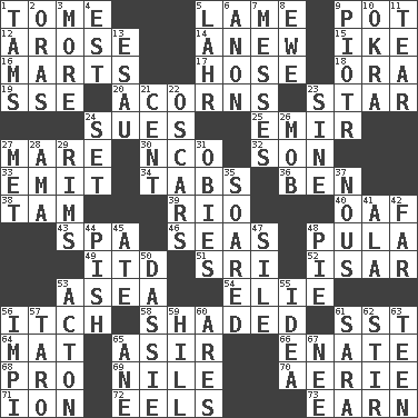 ACROSS 1. Heavy book 5. Unable to walk 9. Plant holder 12. Came up 14. Afresh 15. Eisenhower's nickname 16. Shops 17. Stockings 18. Mouth or opening 19. Compass dir. 20. Oak nuts 23. Play the lead 24. Takes to court 25. Independent ruler or chieftain 27. Female horse 30. Non-commissioned officer (abbr.) 32. Manchild 33. Give off 34. Bar bills 36. Benjamin's nick name 38. Scottish cap 39. _ de Janeiro 40. Clumsy lout 43. Health resort 46. Oceans 48. Monetary unit of Botswana 49. It would 51. Indian title of respect (Mr.) 52. Austrian river, tributary to the Danube 53. Toward the sea 54. Writer Wiesel 56. Hankering 58. Cast a shadow over 61. Fast jet (abbr.) 64. Floor covering 65. SW Saudi Arabia district 66. Maternal 68. Adept person 69. "Death on the ____" 70. Nest on high 71. Electrically charged atom 72. Snakelike fish 73. Merit DOWN 1. Scottish caps 2. Mouths or openings 3. Greater amount 4. Eastern Standard Time (abbr.) 5. Cowardly lion portrayer 6. Soon (poet.) 7. Makes clutter 8. She-sheep 9. Peter (Polish) 10. Gumbo ingredient 11. Lacerate 13. He sold his birthright 21. Penny 22. Motion picture awards 23. Trig term 24. Put into a specified state 26. Disorderly crowd 27. Was introduced to 28. Housemaid (var.) 29. Basketball hoops 31. Off-Broadway awards 35. Flew 37. Horse sense 41. Insect wing 42. Distant 44. Expression of disdain 45. Had dinner 47. Drop; flow; fall 48. Sliced dessert 50. Small ungulate mammals of Africa 53. 13-14th century defensive garment 55. The content of cognition 56. Body of Kaffir warriors 57. Pacific island yam 59. Land elevation 60. Ancient Greek god of war 61. "Two Mules for Sister ____" 62. Commotion 63. Adolescent 65. A saturated hydrocarbon 67. Born
