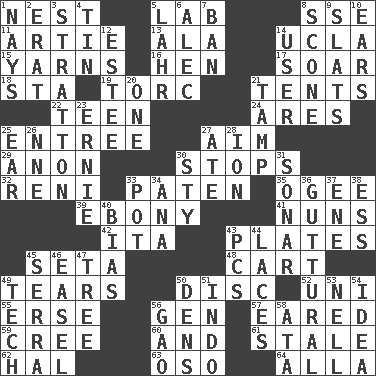 ACROSS 1. A home for chicks 5. Experiment locale 8. Compass dir. 11. Nick name for Arthur 13. According to 14. Southern CA. univ. 15. Tall tales 16. Layer 17. Fly high 18. R.R. building 19. Torque (variant) 21. Portable shelters 22. Adolescent 24. Ancient Greek god of war 25. Main course 27. Direct toward a target or goal 29. At once, immediately (arch.) 30. Constricts 32. Painter Guido (1575-1642) 33. Eucharist need 35. Double curve, resembling the letter S 39. Black 41. Religious women 42. Call ___ day 43. Food holders 45. Bristle 48. Draw slowly or heavily 49. Rends 50. Flat circle 52. Single; one (prefix) 55. Celtic language 56. Commissioned military rank (abbr.) 57. Having ears or earlike features 59. Algonquian 60. Added to 61. Having lost freshness 62. Actor Linden 63. Bear (Spanish) 64. Silent film actress Nazimova DOWN 1. Negative votes 2. Part of Q.E.F. 3. Ski resort town in Vermont 4. Metal container 5. Cowardly lion portrayer 6. Actor Baldwin 7. Bar 8. Biscuitlike quick bread 9. Narrow boards 10. Hearing organs 12. First name in cosmetics 14. One who makes use of a thing 20. Single 21. Pack (down) 23. Bert's buddy 25. Ewer handle 26. Compass dir. 27. Had dinner 28. Electrically charged atom 30. Filthy place 31. Underwater navigation system 33. Cooking vessel 34. Santa ___, CA 36. From the throat 37. Compass dir. 38. Curvy letter 40. Prejudice 43. Personal Computers (abbr.) 44. Shoestrings 45. Father Junipero _ 46. Artist's stand 47. Woody plant 49. Technical 50. Habitations of wild animals 51. Southeast Asian peninsula 53. 1994 drama film starring Jodie Foster 54. The content of cognition 56. E Mali city 58. _ moment's notice (2 wds.)
