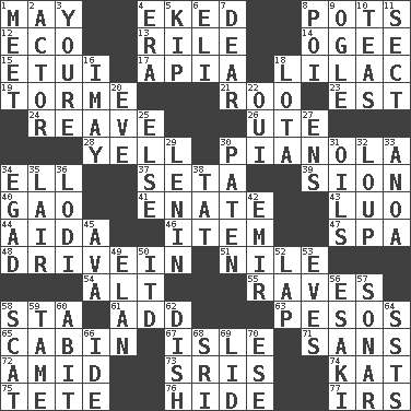 ACROSS 1. Fifth month 4. Made supply last 8. Plant holders 12. Environmental prefix 13. Cause heat under the collar 14. Double curve, resembling the letter S 15. Needle holder 17. Capital of Western Samoa 18. Pale purple color 19. Singer Mel 21. Friend of Pooh 23. Eastern Standard Time (abbr.) 24. Rob, plunder, or pillage 26. Shoshoni 28. Shout 30. Player piano 34. Pipe bend 37. Bristle 39. The Jewish people; Israel 40. E Mali city 41. Maternal 43. Nilotic language 44. Opera by Verdi 46. Detail 47. Health resort 48. Popular '50s hangout 51. The longest river in the world 54. The first octave above the treble staff 55. All-night dance parties 58. R.R. building 61. Say or write further 63. Mexican monetary units 65. Small house or cottage 67. Capri or Wright 71. Without 72. Among 73. Indian titles of respect 74. Krazy ___ of comics 75. Wig 76. Flintstone garb 77. Big collection agency DOWN 1. Confront 2. Thespian 3. You are 4. Epoch 5. Monetary unit of Laos 6. Biblical high priest 7. Letter starter 8. Luau course 9. Stare 10. Beverages made from leaves 11. Religious group 16. "If ____ say so..." 18. Globular water bottle used in Asia 20. First lady 22. Fr. "Yes" 25. Otherwise 27. Followers of ems 29. Soviet premier 1918-24 30. Eucharist need 31. Petroleums 32. Central Nebraska county 33. Small Philippine buffalo 34. Mild oath 35. Den 36. Farming town in central California 38. Make lace 42. Independent ruler or chieftain 45. Actress Gardner 49. Style 50. It would 52. Pet locale 53. Nights before holidays 56. 1973 Nobel Price Winner (Physics) Leo 57. Underwater navigation system 58. Go away! 59. Docile 60. "This won't hurt ____!" 62. Food container 64. Fast planes 66. Binary compound 68. _ Lanka 69. Hat (slang) 70. Compass dir.