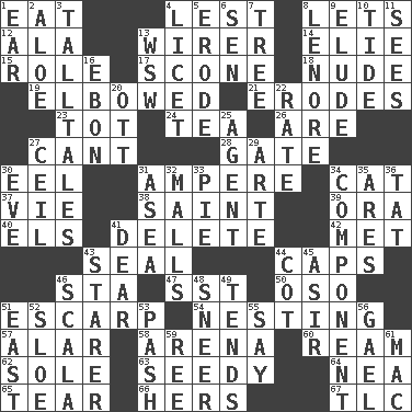ACROSS 1. Consume 4. For fear that 8. Allows 12. Insect wing 13. One who wires 14. Writer Wiesel 15. Hero or heavy, e.g. 17. Biscuitlike quick bread 18. Naked 19. Shoved, as through a crowd 21. Eats (away) 23. Small child 24. Beverage made from leaves 26. "We ___ not amused" (Victoria) 27. Patter 28. Yard entry 30. Snakelike fish 31. Electrical Unit 34. Domesticated feline 37. Compete 38. Virtuous person 39. Mouth or opening 40. Raised railways 41. Keyboard key 42. Was introduced to 43. Lick closed 44. Balmoral and tarboosh 46. R.R. building 47. Fast jet (abbr.) 50. Bear (Spanish) 51. Fortification 54. Nestling 57. Having or resembling wings 58. Sports stadium 60. 480, 500 or 516 sheets of paper 62. Flatfish 63. Sleazy 64. Teachers' org. 65. Separate forcefully 66. Possessive pronoun 67. Affectionate concern, for short DOWN 1. Hearing organ 2. Medicinal plant 3. Baron Munchausen's specialties 4. It is permitted: Lat. 5. Eat (away) 6. Elected rep. 7. Family _ (genealogy) 8. Poe poem 9. Dodge 10. Periodic rise and fall of the sea level 11. Perceives with the eye 13. Compass dir. 16. Inky black, to poets 20. Baseball player Mel 22. Assign a rank or rating to 25. Rep 27. To provide with a ceiling 29. Johnson of "Laugh-In" 30. First lady 31. At sea 32. Promenades 33. Sliced dessert 34. Part 35. Ancient Greek god of war 36. Make lace 41. Letter starter 43. A viewer who gazes fixedly 44. Small bed 45. SW Saudi Arabia district 46. Any of the three canals of the cochlea 48. Contemptuous expression 49. Is inclined (to) 51. Compass direction 52. _ gin 53. Romantic infatuation 55. Declare 56. Highlander 59. To riddle 61. Apple computer (short form)