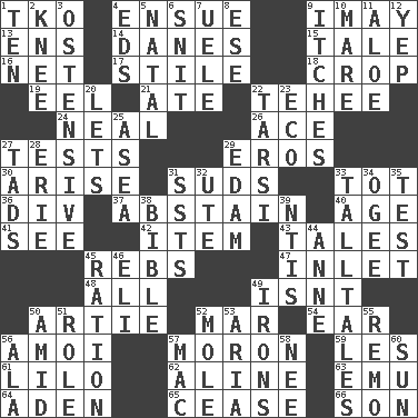ACROSS 1. Ring climax 4. Take place subsequently 9. "If ____ say so..." 13. Followers of ems 14. Natives or inhabitants of Denmark 15. Lie 16. Fish or hair follower 17. Vertical member of a panel or frame 18. Riding implement 19. Snakelike fish 21. Had dinner 22. Giggle 24. Be tempered by heat 26. Adept person 27. Trials 29. Greek god of love 30. Ascend 31. Soap bubbles 33. Small child 36. HTML Container Element 37. Refrain by choice 40. Mature 41. Perceive with the eye 42. A distinct part 43. Lies 45. Confederate soldiers (slang) 47. An arm off of a larger body of water 48. 100% 49. Is not 50. Nick name for Arthur 52. Spoil 54. Ewer handle 56. Mine, in Marseilles 57. Person of subnormal intelligence 59. French article 61. _ and Stitch 62. Place in a line 63. Australian flightless bird 64. An important port of Yemen 65. Stop 66. Manchild DOWN 1. Nine, plus one 2. Leg joint 3. Clearly or manifestly demonstrative 4. Begley and Asner 5. Relating to or accompanying birth 6. In a ____ (agitated or irritated) 7. Ubangi River tributary 8. Compass dir. 9. Strong, restless desires 10. Female horse 11. Medicinal plant 12. Slangy assent 20. Allows 22. Tarsus (plural) 23. Environmental prefix 25. At sea 27. Bits 28. 4th largest of the Great Lakes 29. Dutch treat 31. Fast planes 32. Shoshoni 33. Baron Munchausen's specialties 34. Double curve, resembling the letter S 35. Trial 38. Instruction Manual for Humans 39. Nuclear Threat Initiatives 44. Queen of England 1702-14 45. Food allowance for one day 46. Biblical high priest 49. Removes the wrinkles 50. Among 51. Hero or heavy, e.g. 52. Undercover agent 53. Roberta Peters solo 55. San ____ (Riviera town) 56. According to 57. Apple computer (short form) 58. Born 60. Player for Phoenix