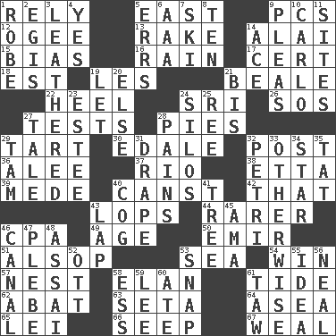ACROSS 1. Have trust in 5. 90 degrees 9. Personal Computers (abbr.) 12. Double curve, resembling the letter S 13. Immoral or dissolute person 14. Jai ____ 15. Prejudice 16. Water falling in drops from the sky 17. Foregone conclusion 18. Eastern Standard Time (abbr.) 19. French article 21. Calif. Air Force Base 22. The bottom of a shoe or boot 24. _ Lanka 26. Mayday 27. Trials 28. Sliced desserts 29. Small pie 30. Peak District village in England 32. Mail 36. Toward shelter 37. River (Sp.) 38. Singer James 39. Ancient Persian 40. 2nd pers. sing. pres. of can (arch.) 42. Not this but _ 43. Chops off 44. More valued for its uncommonness 46. Accounting whiz (abbr.) 49. Grow older 50. Arab leader 51. Columnist Joseph or Stewart 53. Ocean 54. Acquire through effort 57. A home for chicks 58. Enthusiasm 61. Periodic rise and fall of the sea level 62. Blind as ____ 63. Stalk of a moss capsule 64. At sea 65. Flowery wreath 66. Ooze 67. Welt DOWN 1. Loose flowing garment 2. Armor plate that protects the chest 3. Resembling or made to resemble leather 4. Consenting reply 5. Blunders 6. American Automobile Association (abbr.) 7. What Jean-Claude Killy likes to do 8. Nine, plus one 9. Entreaties 10. Monte _, Las Vegas Hotel/Casino 11. Settings 14. Adept person 19. Allow 20. Otherwise 21. Twice 23. First name in cosmetics 24. Grain storage towers 25. Portuguese money of account (variant) 27. Lie 28. Aches 29. Scottish cap 31. Window treatment 32. _ dish (used to culture cells) 33. Else 34. Play the lead 35. Make lace 40. Gear tooth 41. Woody plant 43. Pet locale 45. Housemaid (var.) 46. Lessep's creation 47. First-year military academy student 48. Slender Brazilian palm 52. Baseball player Mel 53. Fastener 55. The main thing one is thinking about 56. Be tempered by heat 58. Double-curved letter 59. Area sheltered from the wind 60. Had dinner 61. The 23rd letter of the Hebrew alphabet