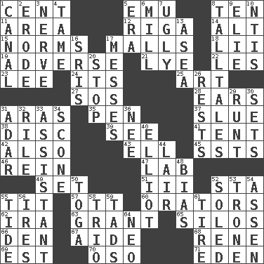 ACROSS 1. Penny 5. Australian flightless bird 8. "___ Little Indians" 11. Type of rug 12. Port city in Latvia 14. Keyboard modifier key 15. Typical models 17. Promenades 18. Cards in a Roman deck? 19. Contrary to your interests or welfare 21. Potassium hydroxide 22. French article 23. Area sheltered from the wind 24. ___ a Wonderful Life 25. Tate display 27. Mayday 28. Hearing organs 31. Caspian sea tributary 35. Fenced enclosure 37. Turn sharply 38. Plate 39. Perceive with the eye 41. Portable shelter 42. In addition 43. Pipe bend 45. Fast planes 46. It's straight from the horse's mouth 47. Experiment locale 49. Arrange properly for use 51. One more than two 52. R.R. building 55. Teat (slang) 57. Baseball player Mel 60. Speakers 62. Retirement account (abbr.) 63. Monetary aid 65. Grain storage towers 66. Lair 67. Helper 68. French philosopher Descartes 69. Eastern Standard Time (abbr.) 70. Bear (Spanish) 71. Genesis locale DOWN 1. Lessep's creation 2. Eat (away) 3. Impudent aggressiveness 4. Docile 5. Period 6. Place where flour is made 7. Unsightly 8. Baron Munchausen's specialties 9. Writer Wiesel 10. Nuclear Threat Initiatives 13. Toward the sea 16. Indian titles of respect 17. Makes clutter 20. Discontinue 26. Musical pauses 29. Undersized animal 30. Puts into a specified state 31. The sixth month of the Jewish calendar 32. Cause heat under the collar 33. Aide 34. Biscuitlike quick bread 36. Born 40. American author Paul (1891-1958) 44. Den 48. Prejudice 50. Ancient Roman robe 52. Having a sole or soles 53. Marketplace scale 54. NE Netherlands city 55. Event that recurs at intervals 56. Angers 58. Musical group of three 59. Bits 61. Hoop that covers a wheel 64. Modern: prefix