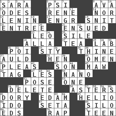 ACROSS 1. "Two Mules for Sister ____" 5. 23rd letter of the Greek alphabet 8. Actress Gardner 11. Lyric poems 12. French philosopher Descartes 14. Not either 15. Soviet premier 1918-24 17. Engineer (abbr.) 18. In a ____ (agitated or irritated) 19. Main course 21. Followed as a consequence or result 23. Lion 25. Drop; flow; fall 26. Silent film actress Nazimova 27. Afternoon social gathering 28. Experiment locale 31. Luau course 33. Filthy place 35. One or ones belonging to thee 37. Old (Scot.) 38. Layer 40. Presage 41. Entreaties 43. Male offspring 45. Informal term for the mouth 46. Label 47. French article 50. Billionth: prefix 52. Airs 53. Single 54. Erase 56. Michaelmas daisies 61. Rowboat 62. Dutch treat 65. Sun: prefix 66. Wedding promise 67. Bristle 68. Grain storage tower 69. Begley and Asner 70. Reproach for some lapse or misdeed 71. Adolescent DOWN 1. Flatfish 2. An important port of Yemen 3. Monthly bill 4. SW Saudi Arabia district 5. Before (prefix) 6. Elected rep. 7. Swallow 8. Singer Murray 9. Null 10. Tate display 13. Bert's buddy 16. 1994 drama film starring Jodie Foster 18. Institute legal proceedings 20. Snakelike fish 22. Narrow board 24. Pledge 26. Opera by Verdi 28. Pale green bean 29. Afresh 30. Benjamin's nick name 31. Monetary unit of Botswana 32. Cassini of fashion 34. It is so 36. Like (prefix) 37. Fitting 39. Words to Nanette 42. A type of plum 44. Grandmother 48. _____ Park, CO 49. Sowing specialist 51. Delicate 52. Strand of rope, yarn or thread 54. Texas town _ City 55. Greek god of love 57. Trial 58. Writer Wiesel 59. Cause heat under the collar 60. Within a short period 61. Pass on 63. _ moment's notice (2 wds.) 64. Atlas unit