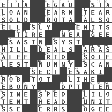 ACROSS 1. Singer James 5. Mild oath 9. R.R. building 12. Grant temporary use of 13. Merit 14. Pull into pieces 15. Disposed of to a purchaser 16. Round or rotation of duties 17. In addition 18. Pipe bend 19. Roguish 21. Gives off 22. Hoop that covers a wheel 24. Teachers' org. 26. Turn to the right 27. Indian antelope 28. System (abbr.) 29. Land elevation 30. Allots cards 32. Caspian sea tributary 36. Toward shelter 37. _ de Janeiro 38. Not divided or shared with others 39. For fear that 40. Pet term 42. Glance over 43. Religious group 44. 1973 Nobel Price Winner (Physics) Leo 46. Director Reiner 49. Small child 50. Welles in "The Third Man" 51. Dark wood 53. Choose 54. "___ Little Indians" 57. Trig term 58. Moved rapidly 61. _ and Stitch 62. Portable shelter 63. Froth on beer 64. A single undivided whole 65. Compass dir. 66. Blunders 67. Double curve, resembling the letter S DOWN 1. Otherwise 2. Implement 3. Baron Munchausen's specialties 4. Plus 5. Suggestive of the supernatural 6. E Mali city 7. Nonscientific branch of learning 8. Heredity factor (abbr.) 9. Major League Baseball Commissioner Bud 10. Clothes sense 11. Came up 14. Scottish cap 19. Indian title of respect (Mr.) 20. Grant temporary use of 21. Consume 23. Small island 24. Thermoplastic polyamide 25. Double-curved letter 27. Drop; flow; fall 28. Inhabitant of Heaven 29. Actor Linden 31. Spew [out] 32. Indian state 33. Shooting up abruptly 34. Mountain range southwest of Kyrgyzstan 35. Elected rep. 40. Modern: prefix 41. Sharp bark 43. Filthy place 45. Be seated 46. Musical pauses 47. Off-Broadway awards 48. Child's nurse 52. Fish or hair follower 53. Likelihood 55. Writer Wiesel 56. Make mention of 58. A female animal or person 59. For each 60. Hearing organ 61. Nilotic language