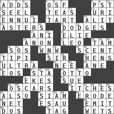 ACROSS 1. Does sums 5. Order of Saint Francis (abbr.) 8. Pacific Standard Time (abbr.) 11. Stitch closed the eyes of (a falcon) 12. Afternoon social gatherings 14. RI univ. 15. World-weariness 17. Small pie 18. Came down and settled, as after flight 19. Michaelmas daisies 21. Evades 23. Cuckoo 25. Writer Wiesel 26. Soon (poet.) 27. Lion 28. Scottish cap 31. Mayday 33. Compass dir. 35. Odor 37. Native american tent (variation) 38. Title for a knight 40. Coop moms 41. Extreme 43. Born 45. A saturated hydrocarbon 46. Greek goddess of the dawn 47. R.R. building 50. Von Bismarck 52. Supplements with great effort 53. Take to court 54. Motion picture awards 56. Strong, restless desires 61. In addition 62. Thailand, formerly 65. Eat (away) 66. Fish or hair follower 67. He sold his birthright 68. Send forth 69. Two (Sp.) 70. Label 71. Soaks DOWN 1. Toward the sea 2. Lairs 3. Gouge 4. Turn sharply 5. Baseball player Mel 6. Ocean 7. Burden 8. Whine 9. Indian titles of respect 10. Teat (slang) 13. Took without asking 16. SW Asia republic 18. Personal question 20. Overwhelm 22. "Vaya con ____" 24. Lodging establishments 26. SW Saudi Arabia district 28. Adolescent 29. Queen of England 1702-14 30. Mountains (abbr.) 31. Grain storage tower 32. Chooses 34. Acquire through effort 36. US Secretary of Labor Elaine L. _ 37. Third day of the wk. 39. Vintage cars 42. "____ silly question..." 44. Needle case 48. Laconic 49. Aid 51. Wig 52. Environmental prefix 54. Butter sub 55. Fast planes 57. Ship's personnel 58. Residence 59. Prepare for publication 60. Arranges properly for use 61. Plus 63. American Automobile Association (abbr.) 64. Large cup