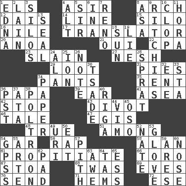 ACROSS 1. Raised railways 4. SW Saudi Arabia district 8. Bowlike part 12. Raised platform 14. Actor's bit 15. Grain storage tower 16. Mediterranean tributary 17. Interpreter 20. Small Philippine buffalo 21. Fr. "Yes" 22. Tax preparer (abbr.) 23. Killed 27. Soft 29. Spoils 31. Sliced desserts 34. Leg coverings 35. Monthly bill 36. Dad 39. Hearing organ 41. At sea 42. Discontinue 43. A piece of turf (Scot.) 46. Story 47. The front part of a cuirass 48. Loyal 51. Amid 54. Slender fish 56. Strike 58. Actor Alda or Thicke 61. Appease 66. "Corrida" creature 67. Portico 68. It was, poetically 69. Nights before holidays 70. Transmit 71. Cloth borders 72. Compass dir. DOWN 1. Pulitzer Prize-winning author Ferber 2. (Had) reclined 3. Grain storage towers 4. Keyboard modifier key 5. Title for a knight 6. _ tizzy (2 wds.) 7. Western Nevada city 8. White ___ sheet 9. Actors Guy, Robert Welles, and Clint 10. Hoof sound 11. Israeli folk dance 13. Lick closed 18. Player for Phoenix 19. Falsehood 24. According to 25. Electrically charged atom 26. Make mention of 28. Small fatty European fish 30. Sadhe (variant) 32. Compass dir. 33. R.R. building 34. Some stationery 36. Pacific Standard Time (abbr.) 37. "One Day ___ Time" 38. Characterized by complete cowardliness 40. Capital of Latvia 44. Zeal 45. Bear (Spanish) 49. RI univ. 50. Ingest 52. Nathan's nickname 53. Michael Jackson trademark 54. Global Positioning Systems (abbr.) 55. Johnson of "Laugh-In" 57. Heart or essence 59. Ancient Greek god of war 60. Sense of smell 62. Groovy apt. 63. Deep reverence 64. Scottish cap 65. Curvy letter