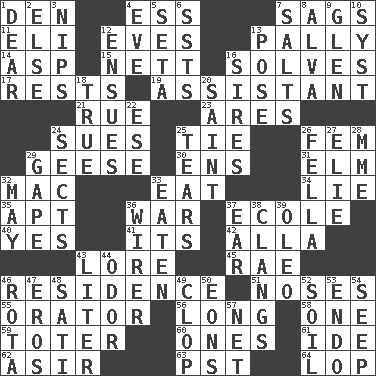 ACROSS 1. Lair 4. Double-curved letter 7. Settles 11. Biblical high priest 12. Nights before holidays 13. Chummy 14. Cleo's killer 15. Remaining after all deductions 16. Finds the solution 17. Musical pauses 19. Helper 21. Regret 23. Ancient Greek god of war 24. Takes to court 25. Make a knot 26. Opposite of masc. 29. Honkers 30. Followers of ems 31. Shade tree 32. Apple computer (short form) 33. Ingest 34. Whopper 35. Fitting 36. Armed conflict 37. Learning spot: Fr. 40. Affirmative reply 41. It is 42. Silent film actress Nazimova 43. Old wives' tales, e.g. 45. Actress Charlotte 46. Home 51. Olfactory organs 55. Speaker 56. Having great length 58. Single 59. Carrier 60. Singles 61. Binary compound 62. SW Saudi Arabia district 63. Pacific Standard Time (abbr.) 64. Trim (branches) DOWN 1. Letter starter 2. Otherwise 3. Pinches, bites 4. First lady 5. Bristle 6. Fast planes 7. Table seasonings 8. Inventor's middle name 9. Small, secluded valley 10. System (abbr.) 12. Takes place subsequently 13. Introduce or present, as a question 16. Titles for men of rank and authority 18. Loyal 20. Inhabitant of Heaven 22. Compass dir. 24. Religious groups 25. Pulls apart 26. Chap (slang) 27. Writer Wiesel 28. Madame (abbr.) 29. Stare wonderingly 32. Can I? 33. Eroded 36. One who wires 37. Hearing organ 38. Rigngs loudly 39. Margarine 43. 61 cubic inches 44. Aroma 46. Roll call or roster of names 47. Greek god of love 48. Suttee (variant) 49. Hoof sound 50. Immeasurably long periods of time 52. Land 53. Inside; within (prefix) 54. Ooze 57. Fish or hair follower