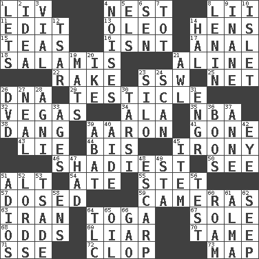 ACROSS 1. 54 in ancient Rome 4. A home for chicks 8. Cards in a Roman deck? 11. Prepare for publication 13. Margarine 14. Coop moms 15. Beverages made from leaves 16. Is not 17. Of or related to the anus 18. Deli grouping 21. Place in a line 22. Immoral or dissolute person 23. Compass dir. 25. Fish or hair follower 26. Heredity factor (abbr.) 29. A testis 32. Viva Las _ 34. According to 35. Basketball assoc. 38. Mild oath, euphamism for damn 39. Composer Copland 41. Went 43. Falsehood 44. Again 45. Literary sarcasm 46. Most dubious of character or honesty 50. Observe 51. Keyboard modifier key 54. Had dinner 55. Proofreading order 57. Administered medicine 59. Devices for capturing images 63. SW Asia republic 64. Ancient Roman robe 67. Flatfish 68. Probability 69. One who doesn't tell the truth 70. Docile 71. Compass dir. 72. Hoof sound 73. Atlas unit DOWN 1. Allows 2. The content of cognition 3. Small bottle 4. Annoying sounds 5. Raised railways 6. Elected rep. 7. Small child 8. Soviet premier 1918-24 9. Empty; void 10. Small island 12. Russian ruler of old 14. Actor Linden 19. Floor coverings 20. D.D.E's nickname 21. Leather borer 23. Grain storage tower 24. Examine hastily 26. Movie disc 27. Be tempered by heat 28. Hindu god of fire 30. Tarsus (plural) 31. Engineer (abbr.) 33. Ripens 36. Scornful sounds 37. Queen of England 1702-14 39. Blind as ____ 40. Assistant 42. Sight organ 45. A distinct part 47. Possessed 48. Fortification 49. R.R. building 51. Goodbye (Sp.) 52. Titled peers of a realm 53. Sadhe (variant) 56. Trial 58. Followers of ems 60. Wander aimlessly 61. _ mater 62. Ooze 64. Affectionate concern, for short 65. Petroleum 66. E Mali city