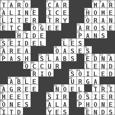 ACROSS 1. Edible starchy tuberous root 5. 4-wheeled motor vehicle 8. Make imperfect 11. Place in a line 13. Frozen water 14. Residence 15. 61 cubic inches 16. Attempt 17. Northwest Algerian city 18. And so on (abbr.) 19. Double curve, resembling the letter S 21. Came up 22. Flintstone garb 24. Baking dishes 25. A glass for beer 27. French article 29. Length times width 30. Fertile tracts in a desert 32. Romantic infatuation 33. Thick slices 35. Pulitzer Prize-winning author Ferber 39. Happen 41. Grant temporary use of 42. River (Sp.) 43. Dirtied 45. Competent 48. Capital and largest city of Mongolia 49. Match 50. Christmas carol 52. Three (prefix) 55. Rendezvous 56. Title for a knight 57. Flexible twig of a willow tree 59. Singles 60. Chicken ___ king 61. Give a jingle 62. It would 63. It is so 64. Extremities DOWN 1. Story 2. Came down and settled, as after flight 3. Actors Guy, Robert Welles, and Clint 4. Single 5. Quote 6. Measure of real estate 7. Marina Del _, California 8. Person of subnormal intelligence 9. Collect or gather 10. French philosopher Descartes 12. Eat (away) 14. Israeli folk dance 20. Set 21. Domed church section 23. Potato state 25. Plant excrement 26. Epoch 27. Experiment locale 28. Double-curved letter 30. Rowing implement 31. Former Milwaukee Brewers owner Bud 33. _-fi 34. Nilotic language 36. Conveyance 37. Compass dir. 38. Find the sum of 40. Algonquian 43. Take to court 44. Fourth or lowest deck 45. Representative 46. A special lineage 47. Allows 49. Mine, in Marseilles 50. "Death on the ____" 51. Mouths or openings 53. Tear apart 54. Angers 56. Declare 58. A female animal or person