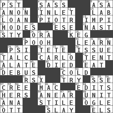 ACROSS 1. Pacific Standard Time (abbr.) 4. Backtalk 8. White ___ sheet 11. Soon (poet.) 13. An arm off of a larger body of water 15. Experiment locale 16. Grant temporary use of 17. Peter (Polish) 18. Body of Kaffir warriors 19. Methods 21. Compass dir. 22. Political cartoonist Thomas 23. Filthy place 24. Mouth or opening 27. Cask 29. "Silly old bear" 30. Acquire or gain knowledge or skills 34. 23rd letter of the Greek alphabet 36. Wig 39. Come out of 40. Baby powder 41. Monte _, Las Vegas Hotel/Casino 43. Portable shelter 44. Having winglike extensions 46. Passed on 47. Ingest 48. To get out of a bus 49. Chilled 51. Acura sports coupe 53. Attempt 54. Compass dir. 57. Algonquian 60. Apple computer (short form) 63. Prepares for publication 65. Possessive pronoun 66. Approach 69. A single undivided whole 70. Santa ___, CA 71. Vertical member of a panel or frame 72. Stare 73. Baseball player Mel 74. Kill 75. Raised railways DOWN 1. Insides of hands 2. Snout, nose 3. Sycophant 4. Small drink 5. Cuckoo 6. _ gin 7. Puts into a specified state 8. _ mater 9. Plant excrements 10. "This won't hurt ____!" 12. Compass dir. 14. Long journey 18. Consumed 20. "Barney Miller" actor Jack 25. College mil. group 26. At or in the front 28. Connecticut Ivy Leaguer 29. Photos 31. Toward the sea 32. Undersized animal 33. Fish or hair follower 34. Diluted with white 35. Thick slice 37. Three (prefix) 38. Choose 40. Small boy 42. Aroma 45. Double-curved letter 50. Sodium hydroxide 52. Dec. holiday 54. Scorch 55. Free from disturbance or agitation 56. _____ Park, CO 57. US Secretary of Labor Elaine L. _ 58. Monthly bill 59. Part of Q.E.F. 61. Pismires 62. To provide with a ceiling 64. Superhero pair 67. Insect wing 68. Marina Del _, California