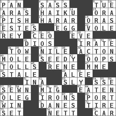 ACROSS 1. Baking dish 4. Backtalk 8. Third day of the wk. 11. Ancient river in northeast Turkey 13. Japanese verse 15. Mouth or opening 16. Expression of disdain 17. Ethiopian city, capital of Harari 18. Mouths or openings 19. _____ Park, CO 21. Oval reproductive body of a fowl 22. Short-tailed, large-bodied rat 23. Marina Del _, California 24. Corporate head (abbr.) 27. First lady 29. "Vaya con ____" 30. Feeling or showing extreme anger 34. Pull behind 36. The longest river in the world 39. NE Massachussets city 40. Undercover agent 41. Sleazy 43. I made a mistake 44. For Whom the Bell _____ 46. French philosopher Descartes 47. Madame (abbr.) 48. Lacking originality or spontaneity 49. Toward shelter 51. _ tizzy (2 wds.) 53. Insidious 54. Compass dir. 57. Stitched 60. Russian fighter aircraft 63. Consumed 65. Cassini of fashion 66. Removes the wrinkles 69. Left side of a ship or aircraft 70. Acquire through effort 71. Natives or inhabitants of Denmark 72. Hoop that covers a wheel 73. Put into a specified state 74. Remaining after all deductions 75. 4-wheeled motor vehicle DOWN 1. Some stationery 2. Originate 3. Offensive 4. Quiet! 5. American Automobile Association (abbr.) 6. The founder of a family 7. Heroin 8. "Corrida" creature 9. Mountain range 10. Relaxation 12. A female animal or person 14. Goad 18. Conquer 20. _-fi 25. Immeasurably long periods of time 26. Flexible twig of a willow tree 28. By way of 29. Home 31. Smallest unit of an element 32. Drink excessively 33. Followers of ems 34. A blast of a horn 35. Spanish pot 37. Area sheltered from the wind 38. Ferber et al. 40. Mountains (abbr.) 42. Shout 45. Elected rep. 50. Sight organ 52. Among 54. Unemotional 55. Spanish missionary in California 56. Keyboard key 57. Sty mamas 58. Writer Wiesel 59. Left 61. SW Asia republic 62. Went 64. Fitting 67. Fish or hair follower 68. Fast jet (abbr.)