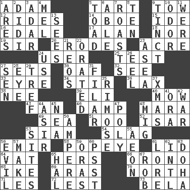 ACROSS 1. First man 5. Small pie 9. Pull behind 12. Amusement-park features 14. Mitch Miller's instrument 15. Binary compound 16. Peak District village in England 17. ____ Jay Lerner 18. Not either 19. Title for a knight 20. Eats (away) 23. Measure of real estate 24. One who makes use of a thing 25. Trial 27. Arranges properly for use 30. Clumsy lout 32. Perceive with the eye 33. Jane of fiction 34. Agitate 36. Not strict 38. Born 39. Connecticut Ivy Leaguer 40. Cut the grass 43. Avid follower 46. Moist 48. Hindu Mythology: god of death 49. Ocean 51. Friend of Pooh 52. Austrian river, tributary to the Danube 53. Thailand, formerly 54. Volcanic refuse 56. Arab leader 58. Wimpy's pal 61. Hat (slang) 64. Large container 65. Possessive pronoun 66. U. of Maine site 68. D.D.E's nickname 69. Ancient river in northeast Turkey 70. 0 degrees 71. French article 72. For fear that 73. Actor Lugosi DOWN 1. Ancient Greek god of war 2. "You Light Up My Life" star Conn 3. The sixth month of the Jewish calendar 4. Cartoonist voice _ Blanc 5. Frog relative 6. Competent 7. Cooks with dry heat, as in an oven 8. "___ Little Indians" 9. Tinged 10. Scent 11. We are 13. Observes 21. Vintage cars 22. Declaimed 23. At sea 24. Purpose 26. Snakelike fish 27. Elected rep. 28. Sight organ 29. Unclean, religiously 31. Having threads 35. Full of chinks, cracks, or crevices 37. Dec. holiday 41. Mouth or opening 42. Armed conflict 44. SW Saudi Arabia district 45. Teachers' org. 47. Much (prefix) 48. Russian fighter aircraft 50. Electrical Unit 53. Settings 55. Age 56. Morally bad or wrong 57. Cause to be 59. Mouths or openings 60. Inconspicuous attention getter 61. Old wives' tales, e.g. 62. International (abbr.) 63. Capital of the state of Qatar 65. Actor Linden 67. Director Reiner