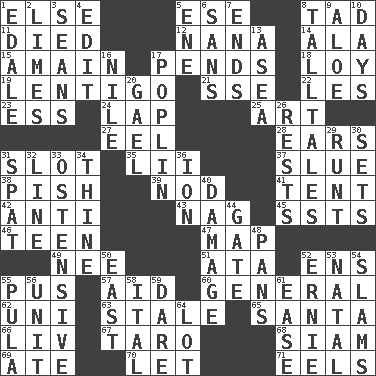 ACROSS 1. Otherwise 5. Compass dir. 8. Small amount or degree 11. Passed on 12. Nanny 14. Chicken ___ king 15. At full speed 17. Hangs 18. Myrna of the movies 19. Small, flat, pigmented spot on the skin 21. Compass dir. 22. French article 23. Curvy letter 24. Pet locale 25. Nonscientific branch of learning 27. Snakelike fish 28. Hearing organs 31. Notch 35. Cards in a Roman deck? 37. Turn sharply 38. Expression of disdain 39. Allow head to fall sleepily 41. Portable shelter 42. Opposed to 43. Tired old horse 45. Fast planes 46. Adolescent 47. Atlas unit 49. Born 51. "One Day ___ Time" 52. Followers of ems 55. Tenth month of the Hindu calendar 57. Assist 60. Commissioned military rank 62. University (slang) 63. Lacking originality or spontaneity 65. Before Barbara or Clara 66. 54 in ancient Rome 67. Edible starchy tuberous root 68. Thailand, formerly 69. Had dinner 70. Allow 71. Snakelike fish DOWN 1. Peak District village in England 2. Citrus fruits 3. Seines 4. Prepare for publication 5. Compass dir. 6. Without 7. Extremities 8. Baron Munchausen's specialties 9. _ vera 10. 24-hour periods 13. At sea 16. Mediterranean tributary 17. Cotton for raincoats, e.g. 20. Highlander 26. Musical pauses 29. The smallest animal of a litter 30. Arranges properly for use 31. Argument over a trivial matter 32. Actor's bit 33. Clearly or manifestly demonstrative 34. One or ones belonging to thee 36. Electrically charged atom 40. Break 44. Yard entry 48. Zero-star reviews 50. 90 degrees 52. Bert's buddy 53. Brizilian seaport 54. Hits or strikes with great force 55. Monetary unit of Botswana 56. A single undivided whole 58. Slanted text style (abbr.) 59. Have the gumption 61. Relaxation 64. Car dealer's back yard