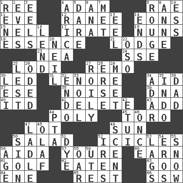 ACROSS 1. To sift 4. First man 8. Actress Charlotte 11. Night before a holiday 12. Indian princess (variant) 14. Immeasurably long periods of time 15. 1994 drama film starring Jodie Foster 17. Feeling or showing extreme anger 18. Religious women 19. Core 21. Inn 23. Teachers' org. 24. Compass dir. 25. Farming town in central California 27. San ____ (Riviera town) 30. Directed 31. Poe poem 34. Assist 37. Compass dir. 38. Annoying sound 39. Heredity factor (abbr.) 40. It would 41. Erase 43. Say or write further 44. Much (prefix) 45. "Corrida" creature 47. Car dealer's back yard 49. Player for Phoenix 50. First course 52. Winter's stalactites 56. Opera by Verdi 57. You are 60. Merit 61. _ course 62. Eroded 63. Thick or sticky substance 64. Compass dir. 65. Repose 66. Compass dir. DOWN 1. French philosopher Descartes 2. Nights before holidays 3. Snakelike fish 4. N. Chile seaport 5. Have the gumption 6. Santa ___, CA 7. Was introduced to 8. Makeup applied to the cheeks 9. Queen of England 1702-14 10. Double-curved letter 13. Snakelike fish 14. Conclusions 16. Grant temporary use of 20. Famous astronaut Armstrong 22. Bear (Spanish) 25. For fear that 26. Wrote a lyric poem 27. Turbulent 28. Celtic language 29. Rendezvous 30. Flowery wreath 32. Inside; within (prefix) 33. Christmas carol 34. The sixth month of the Jewish calendar 35. Southeast Asian peninsula 36. June honoree 42. Needle case 44. Parent Teacher Assoc. 46. At one time in the past 47. Dipping utensil 48. Norwegian king 49. Odor 50. The Jewish people; Israel 51. Color 52. Angers 53. Straggles 54. Greek god of love 55. Overwhelm 56. Mature 58. Rowing implement 59. Shoshoni