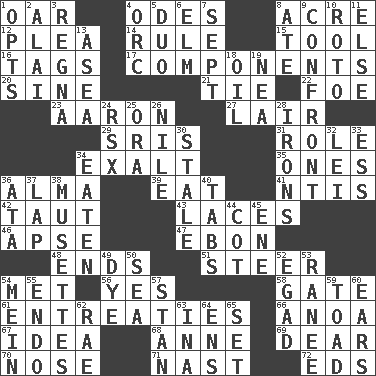ACROSS 1. Boat paddle 4. Lyric poems 8. 43,560 square feet 12. Entreaty 14. Court order 15. Utensil 16. Labels 17. Pieces 20. Trig term 21. Make a knot 22. Enemy 23. Composer Copland 27. Den 29. Indian titles of respect 31. Hero or heavy, e.g. 34. Honor 35. Singles 36. _ mater 39. Erode 41. Nuclear Threat Initiatives 42. Strained 43. Shoestrings 46. Domed church section 47. Inky black, to poets 48. Extremities 51. Guide 54. Was introduced to 56. It is so 58. Yard entry 61. Pleas 66. Small Philippine buffalo 67. The content of cognition 68. Queen of England 1702-14 69. Letter starter 70. Olfactory organ 71. Political cartoonist Thomas 72. Begley and Asner DOWN 1. Elects 2. Jai ____ 3. Rain (Swedish) 4. The grampus (Milton) 5. Superhero pair 6. Shade tree 7. Back-to-school mo. 8. Had dinner 9. Meet 10. Printing process, for short 11. Otherwise 13. Toward the sea 18. Petroleum 19. Teachers' org. 24. Acura sports coupe 25. Mouth or opening 26. The longest river in the world 28. Removes the wrinkles 30. Showing deterioration from age 32. Flowery wreath 33. Curvy letter 34. Consumed 36. _ moment's notice (2 wds.) 37. Infant locale 38. French bagpipes 40. Bar bills 44. Small bed 45. Compass dir. 49. Color 50. Ocean 52. Mild oath 53. The wife of a rajah (variant) 54. Chow _ 55. Inside; within (prefix) 57. Comedian Laurel of Laurel & Hardy 59. Frog relative 60. Hearing organs 62. Actress Charlotte 63. _ tizzy (2 wds.) 64. Followers of ems 65. Put into a specified state