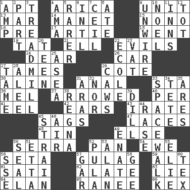 ACROSS 1. Fitting 4. N. Chile seaport 9. A single undivided whole 13. Spoil 14. French painter Edouard 15. Words to Nanette 16. Before (prefix) 17. Nick name for Arthur 18. Left 19. Make lace 21. Pipe bend 22. Vices 24. Letter starter 26. Auto 27. Softens 29. ____ d'Azur (French Riviera) 30. Place in a line 31. Of or related to the anus 33. R.R. building 36. Cartoonist voice _ Blanc 37. Moved like an arrow 40. For each 41. Snakelike fish 42. Hearing organs 43. Feeling or showing extreme anger 45. Sinks 47. Shoestrings 48. Shallow baking pan 49. Otherwise 50. Father Junipero _ 52. Baking dish 54. She-sheep 56. Bristle 57. Russian prison camp 59. The first octave above the treble staff 61. Suttee (variant) 62. Having winglike extensions 63. Falsehood 64. Style 65. Indian princess (variant) 66. Dry husk or covering DOWN 1. Electrical Unit 2. Role in a play 3. Excercise machine 4. Nursemaid (var.) 5. More valued for its uncommonness 6. International (abbr.) 7. To provide with a ceiling 8. Had dinner 9. Undo the wiring of 10. Christmas carol 11. Restaurants 12. Small child 20. Adolescent 22. Learning spot: Fr. 23. Large container 25. Toward the sea 27. Not wild 28. Toward shelter 29. Crow sounds 31. Ancient river in northeast Turkey 32. Or not 33. High altitude stroll 34. Wig 35. Ancient Greek god of war 38. Canadian anthropologist Darnell 39. Deli pickle 44. Raze (variant) 45. Put through a sieve 46. Atmosphere 49. Maternal 50. Lick closed 51. Singer James 52. Monetary unit of Botswana 53. ____ Jay Lerner 55. Writer Wiesel 56. Compass dir. 57. Slender fish 58. Turn to the right 60. John Ritter's dad