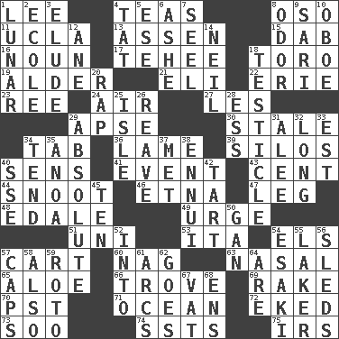 ACROSS 1. Area sheltered from the wind 4. Beverages made from leaves 8. Bear (Spanish) 11. Southern CA. univ. 13. NE Netherlands city 15. Apply (a substance) by light strokes 16. Part of speech 17. Giggle 18. "Corrida" creature 19. Tree or shrub in the Birch family 21. Biblical high priest 22. One of the Great Lakes 23. To riddle 24. Atmosphere 27. French article 29. Domed church section 30. Lacking originality or spontaneity 34. Keyboard key 36. Unable to walk 39. Grain storage towers 40. Elected reps. 41. Happening 43. Penny 44. Snob 46. Inactive volcano in Sicily 47. Part of a journey 48. Peak District village in England 49. Goad 51. Single; one (prefix) 53. Call ___ day 54. Raised railways 57. Haul 60. Tired old horse 63. Rhinal 65. _ vera 66. Collection of objects 69. Libertine 70. Pacific Standard Time (abbr.) 71. Sea 72. Supplemented with great effort 73. "Barney Miller" actor Jack 74. Fast planes 75. Big collection agency DOWN 1. Type of eclipse 2. Learning spot: Fr. 3. Evade 4. Make lace 5. Compass dir. 6. American tennis player Robert 7. Stitch closed the eyes of (a falcon) 8. Scent 9. Indian skirt 10. Mitch Miller's instrument 12. A saturated hydrocarbon 14. Famous astronaut Armstrong 18. A testis 20. Hit sharply and swiftly 25. Capri or Wright 26. Break or tear apart 28. Double-curved letter 29. Utter; complete 31. Toward shelter 32. Protracted 33. Eastern Standard Time (abbr.) 34. Be inclined (to) 35. Small Philippine buffalo 37. Was introduced to 38. World-weariness 40. Compass dir. 42. Small pie 45. "___ Little Indians" 50. Separate the seeds from cotton 52. To the inside or interior of 54. 1973 Nobel Price Winner (Physics) Leo 55. Member of a famous L.A. basketball team 56. Bobsleighs 57. Smile enhancers 58. In addition 59. Printing process, for short 61. Arches 62. Travels 64. "We ___ not amused" (Victoria) 67. Large container 68. Followers of ems
