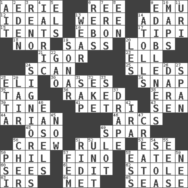 ACROSS 1. Nest on high 6. To sift 9. Australian flightless bird 12. Standard of perfection 13. We are 14. The sixth month of the Jewish calendar 15. Portable shelters 16. Inky black, to poets 17. Native american tent (variation) 18. Not either 19. Backtalk 20. Tennis shots 21. Russian composer Stravinsky 23. Pipe bend 24. Skim 25. Bobsleighs 28. Biblical high priest 30. Fertile tracts in a desert 34. Fastener 35. Label 36. Moved through 38. Period 39. Prong on a fork 41. _ dish (used to culture cells) 43. Elected rep. 44. Believer in; advocate of (suffix) 46. Arches 48. Bear (Spanish) 49. Coast Guard woman 50. Group working together 51. General guideline 53. Compass dir. 56. Silvers or Donahue 57. Fine (Spanish) 58. Ingested 60. Perceives with the eye 61. Prepare for publication 62. Took without asking 63. Big collection agency 64. Was introduced to 65. Gospel singer Marvin DOWN 1. Small island 2. Genesis locale 3. Former U.S. Attorney General Janet 4. Of or pertaining to medicine 5. Raised railways 6. Confederate soldiers (slang) 7. Greek god of love 8. Car or cant ending 9. The property of being fit to eat 10. Atlas contents 11. RI univ. 13. Put on (as clothing) 14. Ringlike coral islands and reefs 19. Underwater navigation system 20. French article 22. E Mali city 24. Seigniories (variant) 26. Have the gumption 27. Connect, as a bridge 28. Singer James 29. Den 31. Plant excrement 32. Supplement with great effort 33. Arrange properly for use 37. Window treatment 40. Artist's stands 42. Lyricist Gershwin 45. Immediately 47. Make 49. Groove 50. "Mermaids" star 51. Travel on or in a vehicle 52. A single undivided whole 54. Portico 55. Snakelike fish 56. Air pressure measure (abbr.) 57. Opposite of masc. 58. Curvy letter 59. Born