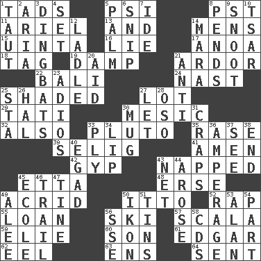 ACROSS 1. Small amounts or degrees 5. 23rd letter of the Greek alphabet 8. Pacific Standard Time (abbr.) 11. Satellite of Uranus 13. Added to 14. Not women's 15. National forest in Provo, Utah 16. Falsehood 17. Small Philippine buffalo 18. Label 19. Moist 21. Zeal 22. Indonesian resort city 24. Political cartoonist Thomas 25. Cast a shadow over 27. Car dealer's back yard 29. Jacques of French films 30. Of or pertaining to a meson 32. In addition 33. Cartoon dog 35. To erase 39. Former Milwaukee Brewers owner Bud 41. So be it 42. Con 43. Slept 45. Singer James 48. Celtic language 49. Bitter 50. "Tell ____ the Marines!" 52. Strike 55. Grant temporary use of 56. What Jean-Claude Killy likes to do 57. Any of the three canals of the cochlea 59. Writer Wiesel 60. Male child 61. _ Allan Poe 62. Snakelike fish 63. Followers of ems 64. Emitted DOWN 1. Drawn tight 2. Roberta Peters solo 3. Empty-headed or silly people 4. Put into a specified state 5. Inside of hand 6. Sever or remove by pinching or nipping 7. Binary compound 8. Depends 9. Snout, nose 10. Russian ruler of old 12. Dipping utensil 14. Hindu Mythology: god of death 20. Assist 21. Opposed to 23. Goodbye (Sp.) 25. R.R. building 26. Actor Linden 27. Allow 28. Bear (Spanish) 30. Java container 31. Dice game 33. Apply oneself diligently 34. Mouth edge 36. Electrical Measurement 37. Observe 38. Conclude 40. Mild oath 43. Fish or hair follower 44. Came up 45. Learning spot: Fr. 46. Drop behind 47. Prong on a fork 49. Toward shelter 50. Picture 51. Airtight sealed metal containers 53. ____ Jay Lerner 54. Component 56. Compass dir. 58. Music discs