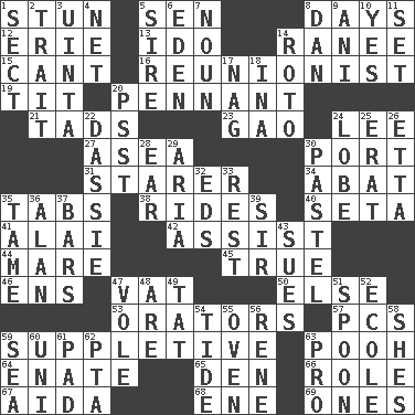 ACROSS 1. Make senseless or dizzy 5. Elected rep. 8. 24-hour periods 12. One of the Great Lakes 13. Wedding promise 14. The wife of a rajah (variant) 15. Patter 16. One who advocates reunion 19. Teat (slang) 20. Pre-World Series prize 21. Bits 23. E Mali city 24. Area sheltered from the wind 27. At sea 30. Left side of a ship or aircraft 31. A viewer who gazes fixedly 34. Blind as ____ 35. Bar bills 38. Amusement-park features 40. Bristle 41. Mountain range southwest of Kyrgyzstan 42. Aid 44. Female horse 45. Loyal 46. Followers of ems 47. Large container 50. Otherwise 53. Speakers 57. Personal Computers (abbr.) 59. Supplying deficiencies 63. "Silly old bear" 64. Maternal 65. Lair 66. Hero or heavy, e.g. 67. Opera by Verdi 68. Compass dir. 69. Washington bills DOWN 1. Religious group 2. Distinguishing feature 3. National forest in Provo, Utah 4. Fish or hair follower 5. The founder of a family 6. Paradise 7. Part of speech 8. One of the 12 tribes of Israel 9. Cuckoo 10. Consenting reply 11. Arrange properly for use 14. Printing process, for short 17. Tired old horse 18. _ tizzy (2 wds.) 20. Inconspicuous attention getter 22. Small ungulate mammals of Africa 24. Ear part 25. Part of Q.E.F. 26. Singer James 28. Ewer handle 29. Roberta Peters solo 30. Soft color 32. Begley and Asner 33. Repose 35. Not wild 36. Actor Alda or Thicke 37. Drinking establishments 39. Title for a knight 43. Institutes legal proceedings 47. Grand slam 48. "We ___ not amused" (Victoria) 49. Make lace 51. Soup utensil 52. Learning spot: Fr. 54. Event that recurs at intervals 55. Baking chamber 56. French philosopher Descartes 58. "______ My Girl" (Turtles hit) 59. Ocean 60. Corn or form start 61. Groovy apt. 62. Parent Teacher Association (abbr.) 63. Adept person