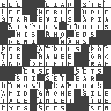 ACROSS 1. Pipe bend 4. One who doesn't tell the truth 8. Proofreading order 12. Area sheltered from the wind 13. Haggard of country music 14. Hollow 15. Play the lead 17. Vices 18. Capital of Western Samoa 19. Paper fasteners 21. Threesomes 23. Part of HMS, perhaps 24. 17th letter of the Greek alphabet 26. Begley and Asner 27. Painter Guido (1575-1642) 28. Armed conflicts 30. For each 31. Ringlike coral islands and reefs 34. Luau course 37. Make a knot 38. Indian princess (variant) 39. The grampus (Milton) 40. Also 41. Keyboard key 42. Actress Charlotte 43. Relaxation 44. Arranges properly for use 46. _ Lanka 47. Arrange properly for use 50. Ewer handle 51. Full of chinks, cracks, or crevices 54. Devices for capturing images 57. Among 58. Dwarf 60. Filth; sediment 62. Story 63. An arm off of a larger body of water 64. Third day of the wk. 65. Snake ____ (dice throw) 66. Perceives with the eye 67. Elected rep. DOWN 1. Raised railways 2. Allows 3. Tough but pliablecoriaceous 4. Crowbar 5. From or relating to Ireland 6. 100% 7. Remainder 8. Broken pieces 9. Drinks excessively 10. Writer Wiesel 11. Beverages made from leaves 13. Cartoonist voice _ Blanc 16. Precipitation 20. Air pressure measure (abbr.) 22. Possessive pronoun 25. A small or young owl 27. It's straight from the horse's mouth 29. Toward shelter 30. Parent Teacher Assoc. 31. Ancient Greek god of war 32. Falsehoods 33. Single 34. Likenesses of persons 35. Mouths or openings 36. Frozen water 41. Raised platform 43. Eats (away) 44. Perceive with the eye 45. Hearing organs 46. Grin 48. Learning spot: Fr. 49. Makes less strong or intense 51. Pace 52. "If ____ say so..." 53. The front part of a cuirass 55. Was introduced to 56. Turn sharply 59. Compass dir. 61. Car or cant ending