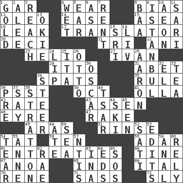 ACROSS 1. Slender fish 4. Erode 8. Prejudice 12. Margarine 14. Relaxation 15. Toward the sea 16. Path through which fluid escapes 17. Interpreter 20. Tenth: prefix 21. Three (prefix) 22. Cuckoo 23. Sun: prefix 27. _ the terrible 29. "Tell ____ the Marines!" 31. Collude with 34. Arguments over trivial matters 35. General guideline 36. Inconspicuous attention getter 39. Sep. follower 41. Water jar 42. Pace 43. NE Netherlands city 46. Jane of fiction 47. Immoral or dissolute person 48. Ancient river in northeast Turkey 51. Wash lightly 54. Make lace 56. "___ Little Indians" 58. The sixth month of the Jewish calendar 61. Pleas 66. Prong on a fork 67. Small Philippine buffalo 68. Southeast Asian peninsula 69. Slanted text style (abbr.) 70. French philosopher Descartes 71. Backtalk 72. Cunning DOWN 1. Precious metal 2. Toward shelter 3. Arrive at 4. Dripping 5. Hearing organ 6. White ___ sheet 7. Monthly bill 8. Sound made by sheep 9. Byzantium, centuries later 10. Age 11. Indian skirt 13. Migrant worker of the '30s 18. Indian title of respect (Mr.) 19. 54 in ancient Rome 24. Mouth edge 25. Call ___ day 26. "Beetle Bailey" pooch 28. Composer Copland 30. Motion picture award 32. Pipe bend 33. Afternoon social gathering 34. Bull 36. Before (prefix) 37. Declare 38. Ski resort town in Vermont 40. Russian ruler of old 44. What Jean-Claude Killy likes to do 45. Car or cant ending 49. Had dinner 50. Ocean 52. Suttee (variant) 53. Proofreads 54. Separate forcefully 55. Queen of England 1702-14 57. Nuclear Threat Initiatives 59. Of or related to the anus 60. Depend 62. Actress Charlotte 63. _ tizzy (2 wds.) 64. Begley and Asner 65. Mayday