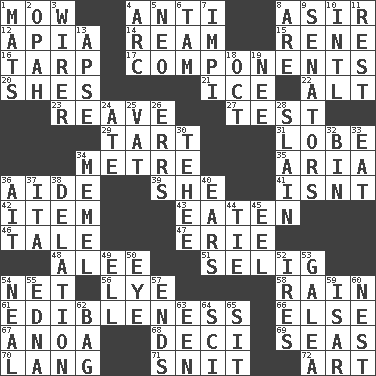 ACROSS 1. Cut the grass 4. Against 8. SW Saudi Arabia district 12. Capital of Western Samoa 14. 480, 500 or 516 sheets of paper 15. French philosopher Descartes 16. Canvas cover 17. Parts 20. "______ My Girl" (Turtles hit) 21. Frozen water 22. Keyboard modifier key 23. Rob, plunder, or pillage 27. Trial 29. Small pie 31. Ear part 34. Distance measurement (Brit.) 35. Roberta Peters solo 36. Helper 39. A female animal or person 41. Is not 42. A distinct part 43. Consumed 46. Story 47. 4th largest of the Great Lakes 48. Toward shelter 51. Former Milwaukee Brewers owner Bud 54. Fish or hair follower 56. Sodium hydroxide 58. Water falling in drops from the sky 61. The property of being fit to eat 66. Otherwise 67. Small Philippine buffalo 68. Tenth: prefix 69. Oceans 70. Austrian-born American filmmaker Fritz 71. In a ____ (agitated or irritated) 72. Tate display DOWN 1. Floor protectors 2. Brightly colored fish 3. One who wires 4. Curve 5. Modern: prefix 6. Scottish cap 7. Body of Kaffir warriors 8. "We ___ not amused" (Victoria) 9. Legislators 10. International (abbr.) 11. Respite 13. Domed church section 18. Sep. follower 19. Born 24. Had dinner 25. Large container 26. Blunders 28. Killed 30. Giggle 32. Storage container 33. Erode 34. Klaipeda city 36. Small island 37. Call ___ day 38. Accusation by an informer 40. Hearing organs 44. Standoff 45. Snakelike fish 49. Pipe bend 50. Sight organ 52. Angers 53. An organ shaped like a helmet 54. Anneal 55. Pulitzer Prize-winning author Ferber 57. Extremities 59. Austrian river, tributary to the Danube 60. A home for chicks 62. Container for groceries 63. Car or cant ending 64. _-fi 65. Be seated