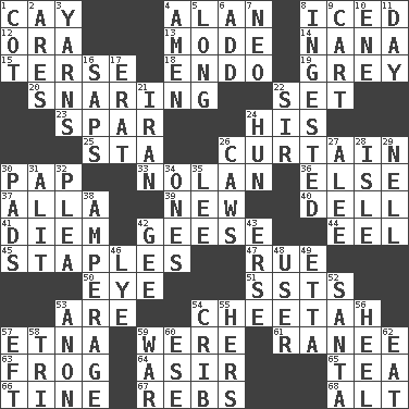 ACROSS 1. Island 4. Actor Alda or Thicke 8. On the rocks 12. Mouth or opening 13. Method 14. Grandmother 15. Laconic 18. Inside; within (prefix) 19. Jennifer or Joel 20. Catching in a trap 22. Arrange properly for use 23. Practice fight 24. Part of HMS, perhaps 25. R.R. building 26. Window treatment 30. Infant food 33. Pitcher Ryan 36. Otherwise 37. Silent film actress Nazimova 39. ___ Haven, CT 40. Small valley 41. South Vietnam president (1954) 42. Honkers 44. Snakelike fish 45. Paper fasteners 47. Sorrow 50. Sight organ 51. Fast planes 53. "We ___ not amused" (Victoria) 54. Leopard's kin 57. Inactive volcano in Sicily 59. Past tense of be (plural) 61. Indian princess (variant) 63. Toadlike animal 64. SW Saudi Arabia district 65. Afternoon social gathering 66. Prong on a fork 67. Confederate soldiers (slang) 68. The first octave above the treble staff DOWN 1. Small bed 2. Ancient Greek god of war 3. Tall tales 4. So be it 5. Yearn 6. Say or write further 7. Modern: prefix 8. Swallowed 9. Heavy open wagon 10. Compass dir. 11. 24 hours 16. Plant excrements 17. Part of Q.E.F. 21. SW Asia republic 22. Title for a knight 24. Attila the _ 26. Crow sounds 27. Toward shelter 28. Capri or Wright 29. 1994 drama film starring Jodie Foster 30. Writing tablets 31. Came down and settled, as after flight 32. Entreaty 34. Washington bills 35. Area sheltered from the wind 38. Electrical Measurement 42. Unit of force equal to gravity 43. Celtic language 46. Potassium hydroxide 48. One who uses or employs something 49. Singer James 52. Before Barbara or Clara 53. At once, immediately (arch.) 54. Baby bed with high sides 55. Possessive pronoun 56. Person who is morally reprehensible 57. Newt 58. Three (prefix) 59. Armed conflict 60. Compass dir. 62. Erode