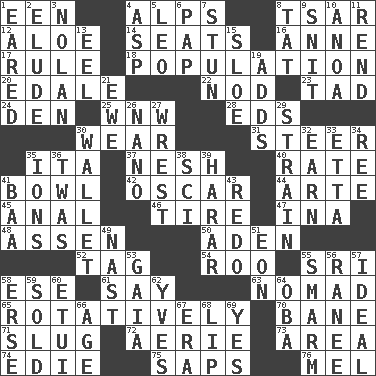 ACROSS 1. Car or cant ending 4. High mountains 8. Russian ruler of old 12. Medicinal plant 14. Theater features 16. Queen of England 1702-14 17. Court order 18. Census information 20. Peak District village in England 22. Dreamland 23. Small amount or degree 24. Lair 25. Compass dir. 28. Begley and Asner 30. Put on (as clothing) 31. Guide 35. Call ___ day 37. Soft 40. Assign a rank or rating to 41. Soup holder 42. Witty Wilde 44. Johnson of "Laugh-In" 45. Of or related to the anus 46. Hoop that covers a wheel 47. _ tizzy (2 wds.) 48. NE Netherlands city 50. Arabian gulf 52. Label 54. Friend of Pooh 55. Indian title of respect (Mr.) 58. Compass dir. 61. Declare 63. Roamer 65. Producing rotation 70. Object of repulsion 71. Snaillike creature with no shell 72. Nest on high 73. Type of rug 74. Singer Brickell 75. Plant excrements 76. Cartoonist voice _ Blanc DOWN 1. Having ears or earlike features 2. Evade 3. Pitcher Ryan 4. Cleo's killer 5. Lion 6. Infant food 7. Surprise greatly 8. Make lace 9. In a ____ (agitated or irritated) 10. Small Philippine buffalo 11. Tear apart 13. Snakelike fish 15. _ gin 19. Sums up 21. She-sheep 26. Billionth: prefix 27. Take or capture by force 29. Put through a sieve 30. Place for singles 32. Merit 33. Singer James 34. Portuguese money of account (variant) 35. Charged particles 36. It was, poetically 38. _-fi 39. Ethiopian city, capital of Harari 41. Sound made by sheep 43. Make new 49. Political cartoonist Thomas 51. Age 53. Greek goddess of the earth (variant) 55. Excessive but superficial compliments 56. Indian princess (variant) 57. Perfect 58. Celtic language 59. Disposed of to a purchaser 60. Needle holder 62. Jacques Cousteau's middle name 64. Chief or king in Benin or Nigeria 66. Mature 67. Period 68. Mouth edge 69. It is so
