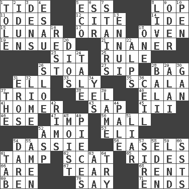 ACROSS 1. Periodic rise and fall of the sea level 5. Curvy letter 8. Trim (branches) 11. Lyric poems 12. Quote 14. Binary compound 15. Type of eclipse 17. Northwest Algerian city 18. Baking chamber 19. Took place subsequently 21. More empty; more void 23. Be seated 25. General guideline 26. Portico 27. Small drink 28. Paper or plastic container 31. Pipe bend 33. Secret 35. Any of the three canals of the cochlea 37. Musical group of three 38. Snakelike fish 40. Flair 41. Simpsons dad 43. Plant excrement 45. One more than two 46. Compass dir. 47. Mischievous child 50. Shopping center 52. Mine, in Marseilles 53. Connecticut Ivy Leaguer 54. Small ungulate mammals of Africa 56. Artist's stands 61. Pack (down) 62. Scram, to a cat 65. Amusement-park features 66. "We ___ not amused" (Victoria) 67. Pull apart 68. Monthly bill 69. Benjamin's nick name 70. Declare 71. Conclusions DOWN 1. Lacquered or enameled metalware 2. Goddess of spring and wife of Bragi 3. Hiding places for outlaws 4. He sold his birthright 5. Environmental prefix 6. Title for a knight 7. Flight of steps 8. Not recorded 9. Baltic tributary 10. Animal enclosure 13. World-weariness 16. Relief 18. Single 20. "Vaya con ____" 22. High mountains 24. Lie 26. _ gin 28. Indonesian resort city 29. Jai ____ 30. Separate the seeds from cotton 31. Greek god of love 32. Welles in "The Third Man" 34. It is so 36. To provide with a ceiling 37. Definite Article 39. Unable to walk 42. Basketball hoops 44. Light colored 48. Wet 49. Parts 51. One who doesn't tell the truth 52. Viper 54. Have the gumption 55. So be it 57. Male parent of an animal 58. Paradise 59. Grant temporary use of 60. Fast planes 61. Bar bill 63. American Automobile Association (abbr.) 64. Attempt