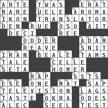 ACROSS 1. Johnson of "Laugh-In" 5. It was, poetically 9. Part of Q.E.F. 13. Female horse 14. Ubangi River tributary 15. Odor 16. Picture 17. Interpreter 19. Lair 20. Sorrow 21. Bear (Spanish) 22. Small island 23. Tenth: prefix 25. To sift 26. More peculiar 30. First man 34. Rob, plunder, or pillage 35. In a ____ (agitated or irritated) 36. SW Asia republic 39. Memphis, Tenn. Street 42. Scottish caps 43. Falsehood 44. Cell (Danish) 46. Stalk of a moss capsule 47. Home run 48. Hit sharply and swiftly 51. Fast planes 54. Compass dir. 57. Single 58. Floor covering 60. Plant excrement 62. Boob tube 65. Falls behind 66. Clothes sense 67. Gumbo ingredient 68. Lyric poems 69. Actor Baldwin 70. Stitch closed the eyes of (a falcon) 71. Trial DOWN 1. Among 2. Moved through 3. Heavy duty weighing machine 4. Car or cant ending 5. Ballerina skirt 6. We are 7. According to 8. Sir (Sp.) 9. Epoch 10. Round or rotation of duties 11. Mine, in Marseilles 12. Small pie 15. Medicinal plant 18. Compass dir. 20. Travel on or in a vehicle 24. Pupil covering 27. Apply (a substance) by light strokes 28. Night before a holiday 29. Arrive at 30. Michaelmas daisies 31. Heredity factor (abbr.) 32. Direct toward a target or goal 33. Mountains (abbr.) 36. ___ a Wonderful Life 37. Actress Charlotte 38. The first octave above the treble staff 40. Lion 41. Shade tree 45. For fear that 48. Be footloose 49. Black tropical American cuckoo 50. Mexican monetary units 52. Sadhe (variant) 53. Gurus 54. Singer James 55. Lick closed 56. Otherwise 58. Greater amount 59. Of or related to the anus 61. Inconspicuous attention getter 63. And so on (abbr.) 64. D.D.E's nickname 65. Car dealer's back yard
