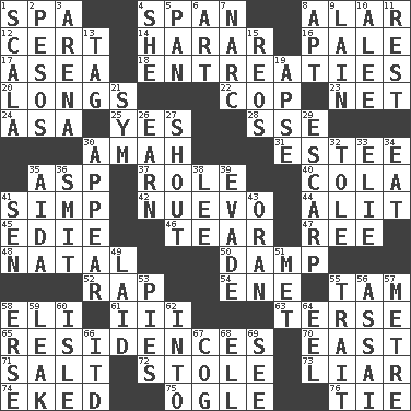 ACROSS 1. Health resort 4. Connect, as a bridge 8. Having or resembling wings 12. An absolute certainty 14. Ethiopian city, capital of Harari 16. Light colored 17. At sea 18. Pleas 20. Yearns 22. Police officer (slang) 23. Fish or hair follower 24. White ___ sheet 25. Affirmative reply 28. Compass dir. 30. Nanny 31. First name in cosmetics 35. Cleo's killer 37. Hero or heavy, e.g. 40. Root beer relative 41. Simple or foolish person 42. New (sp.) 44. Came down and settled, as after flight 45. Singer Brickell 46. Pull apart 47. Portuguese money of account (variant) 48. Brizilian seaport 50. Moist 52. Strike 54. Compass dir. 55. Scottish cap 58. Connecticut Ivy Leaguer 61. One more than two 63. Laconic 65. Homes 70. Compass direction 71. Table seasoning 72. Fur scarf 73. One who doesn't tell the truth 74. Supplemented with great effort 75. Stare at amorously 76. Make a knot DOWN 1. Any of the three canals of the cochlea 2. Mexican monetary units 3. Sports stadium 4. A female animal or person 5. Baking dish 6. Tate display 7. Drug cop 8. Fitting 9. (Had) reclined 10. Toward shelter 11. Repose 13. Label 15. Vintage cars 19. Domed church section 21. Symbol (abbr.) 26. Merit 27. Yell 29. Fortification 30. Become visible 32. Lacquered or enameled metalware 33. Writer Wiesel 34. Ingest 35. Opera by Verdi 36. Stricken, poetically 38. Area sheltered from the wind 39. Elude 41. Elected rep. 43. NW Algerian seaport 49. Put down 51. Was introduced to 53. Sliced desserts 55. Distinguishing feature 56. Slender Brazilian palm 57. Distance measurement (Brit.) 58. Celtic language 59. Path through which fluid escapes 60. Capri or Wright 62. To the inside or interior of 64. Snakelike fish 66. It would 67. Gear tooth 68. Pipe bend 69. Perceive with the eye