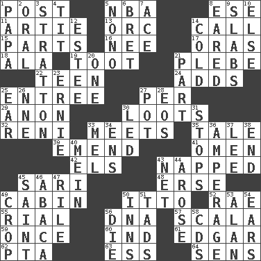 ACROSS 1. Mail 5. Basketball assoc. 8. Compass dir. 11. Nick name for Arthur 13. The grampus (Milton) 14. Give a ring to 15. Pieces 16. Born 17. Mouths or openings 18. According to 19. A blast of a horn 21. Military trainee 22. Adolescent 24. Does sums 25. Main course 27. For each 29. Soon (poet.) 30. Plunders 32. Painter Guido (1575-1642) 33. Confronts 35. Lie 39. Make improvements or corrections to 41. Sign of things to come 42. Raised railways 43. Slept 45. Indian skirt 48. Celtic language 49. Apartment or room in a ship 50. "Tell ____ the Marines!" 52. Actress Charlotte 55. Monetary unit of Yemen 56. Heredity factor (abbr.) 57. Any of the three canals of the cochlea 59. At one time in the past 60. Working for oneself (abbr.) 61. _ Allan Poe 62. Parent Teacher Assoc. 63. Double-curved letter 64. Elected reps. DOWN 1. Dad 2. Spoken 3. Ski resort town in Vermont 4. Teat (slang) 5. Words to Nanette 6. Cy Young winner Saberhagen 7. Adept person 8. Having ears or earlike features 9. Broad, flat, thick pieces 10. Otherwise 12. First name in cosmetics 14. Having a low temperature 20. Single 21. Piece 23. Bert's buddy 25. Ewer handle 26. Compass dir. 27. Plant holder 28. Greek goddess of the dawn 30. Directed 31. Halts 33. Cartoonist voice _ Blanc 34. Followers of ems 36. Electrical Measurement 37. Area sheltered from the wind 38. Conclude 40. Chow _ 43. Fish or hair follower 44. Came up 45. Inhabitant of Heaven 46. Phillipine bananalike plant 47. Cause heat under the collar 49. Riding implement 50. Taverns 51. Small boys 53. Actor Alda or Thicke 54. Hearing organs 56. Expire 58. Music discs