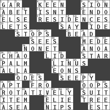 ACROSS 1. Slender fish 4. Peachy ____! 8. The Jewish people; Israel 12. Collude with 14. Is not 15. Inside; within (prefix) 16. Otherwise 17. Dwellings 20. Allows 21. Declare 22. Binary compound 23. Obstructs or blocks passage 27. Necklace unit 29. Perceives with the eye 31. Ancient Persian 34. Music written for nine 35. Small Philippine buffalo 36. US Secretary of Labor Elaine L. _ 39. Flaplike covering 41. Play the lead 42. Inside of hand 43. "_ and Lucy" (Charlie Brown theme song) 46. Silent film actress Nazimova 47. Immeasurably long periods of time 48. Lyric poems 51. Oozy 54. Fitting 56. Back 58. I made a mistake 61. Producing rotation 66. Costume for a special activity 67. Detail 68. Writer Wiesel 69. Woody plant 70. At sea 71. Cuts off 72. Eastern Standard Time (abbr.) DOWN 1. Highlander 2. Competent 3. Musical pauses 4. Apertif with cassis 5. Compass dir. 6. Followers of ems 7. Nuclear Threat Initiatives 8. Elected rep. 9. Event 10. Wrote a lyric poem 11. Characteristic smell of wine 13. Trial 18. Pat or tap gently 19. Sight organ 24. Bear (Spanish) 25. Animal enclosure 26. Sew up the eyelids of hawks and falcons 28. Collect or gather 30. Vertical member of a panel or frame 32. ___ good deed 33. Ewer handle 34. Wanderer 36. Accounting whiz (abbr.) 37. Actor Linden 38. One to whom something is allotted 40. "Vaya con ____" 44. Compass dir. 45. Purpose 49. Newt 50. _ Lanka 52. Mail 53. You are 54. Roberta Peters solo 55. Cooking vessels 57. Baking chamber 59. Sliced desserts 60. Proofreading order 62. Housemaid (var.) 63. Connecticut Ivy Leaguer 64. Mouth edge 65. Consenting reply