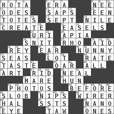 ACROSS 1. Roll call or roster of names 5. Period 8. Born 11. Lyric poems 12. Plant excrements 14. Car or cant ending 15. Lugs 17. Back-to-school mo. 18. Mediterranean tributary 19. Make 21. Artist's stands 23. RI univ. 25. Capital of Western Samoa 26. In a ____ (agitated or irritated) 27. 17th letter of the Greek alphabet 28. Help 31. Marina Del _, California 33. Hearing organ 35. Pet term 37. Oceans 38. Car dealer's back yard 40. Assign a rank or rating to 41. Clothes sense 43. Rowing implement 45. Everything 46. Nonscientific branch of learning 47. To free from 50. Actress Patricia 52. Female horse 53. Attila the _ 54. Pictures 56. Prior to 61. Oscar Madison type 62. Cuts off 65. One who wires 66. Actor Linden 67. Fast planes 68. Billionth: prefix 69. Sight organ 70. The 23rd letter of the Hebrew alphabet 71. Singles DOWN 1. College mil. group 2. Scent 3. Wig 4. At sea 5. Double-curved letter 6. Actress Charlotte 7. Seem 8. Famous astronaut Armstrong 9. Snakelike fish 10. Compass dir. 13. Staphylococcus 16. Astound 18. Teachers' org. 20. One of the Great Lakes 22. The Jewish people; Israel 24. Slanted text style (abbr.) 26. System (abbr.) 28. Of or related to the anus 29. International (abbr.) 30. Color 31. Hitchcock's "____ Window" 32. 90 degrees 34. Friend of Pooh 36. Mountain range 37. R.R. building 39. Hyperbolic tangent 42. Part of Q.E.F. 44. Reuben's nickname 48. Metal shackles 49. Stop 51. Afresh 52. Crowd into 54. Frolic 55. Hollow 57. A pale, very dry sherry 58. NW Algerian seaport 59. French philosopher Descartes 60. Greek god of love 61. A female animal or person 63. Parent Teacher Assoc. 64. Compass dir.