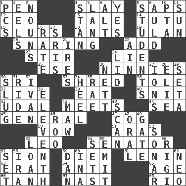 ACROSS 1. Writing instrument 4. Kill 8. Plant excrements 12. Corporate head (abbr.) 13. Story 14. Ballerina skirt 15. Plays smoothly or legato 18. Pismires 19. ____ Bator, Mongolia 20. Catching in a trap 22. Find the sum of 23. Use a spoon 24. Untruth 25. Compass dir. 26. Simpletons 30. Indian title of respect (Mr.) 33. Tear up 36. Lacquered or enameled metalware 37. Moving, as bait 39. Erode 40. In a ____ (agitated or irritated) 41. Allodial 42. Confronts 44. Ocean 45. Commissioned military rank 47. Gear tooth 50. Promise 51. Ancient river in northeast Turkey 53. Lion 54. Legislator 57. The Jewish people; Israel 59. South Vietnam president (1954) 61. Soviet premier 1918-24 63. Part of Q.E.F. 64. Against 65. Mature 66. Hyperbolic tangent 67. Political cartoonist Thomas 68. River (Sp.) DOWN 1. Personal Computers (abbr.) 2. Snakelike fish 3. Parts of speech 4. Comedian Laurel of Laurel & Hardy 5. Austrian-born American filmmaker Fritz 6. Keyboard modifier key 7. It is so 8. SAT takers 9. Old (Scot.) 10. Parent Teacher Assoc. 11. Player for Phoenix 16. Assign a rank or rating to 17. Indian titles of respect 21. Angers 22. The 18th letter of the Arabic alphabet 24. Hat (slang) 26. Remaining after all deductions 27. Charged particles 28. Writer Wiesel 29. Stalk of a moss capsule 30. A hard, heavy blow 31. Travel on or in a vehicle 32. _ the terrible 34. The bottom of a shoe or boot 35. Actress Charlotte 38. Veterans Day date 42. Opening into something insatiable 43. Examine minutely or intensely 46. Friend of Pooh 48. Relating to the mouth 49. Yard entry 52. Underwater navigation system 53. Grant temporary use of 54. Puts into a specified state 55. Give off 56. Swiss mountan, "Queen of the Mountains" 57. Arrange properly for use 58. Lyricist Gershwin 59. Daniel's nick name 60. _ tizzy (2 wds.) 62. Modern: prefix