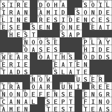 ACROSS 1. The founder of a family 5. Capital of the state of Qatar 9. Land 13. SW Asia republic 14. Among 15. Something which is sent 16. Actor's bit 17. Dwellings 19. Compass dir. 20. Elected rep. 21. Single 22. Ingest 23. Command 25. Plant excrement 26. Trap for birds or small mammals 30. Shaw product 34. Fertile tracts in a desert 35. Flintstone garb 36. Put on (as clothing) 39. Expletives 42. Probability 43. 4th largest of the Great Lakes 44. Ingested 46. Bits 47. Schedule 48. Immediately 51. One who uses or employs something 54. Lyricist Gershwin 57. Rowing implement 58. University (slang) 60. To separate or throw off 62. Unrelated to defense, as in spending 65. Engineer (abbr.) 66. Lessep's creation 67. Back-to-school mo. 68. A pale, very dry sherry 69. So be it 70. Trial 71. Beverages made from leaves DOWN 1. Drop; flow; fall 2. From or relating to Ireland 3. The wife of a rajah (variant) 4. Compass dir. 5. Have the gumption 6. Sign of things to come 7. Part of HMS, perhaps 8. Goodbye (Sp.) 9. Manchild 10. At one time in the past 11. It may be bright or harebrained 12. For fear that 15. Ooze 18. Heredity factor (abbr.) 20. Portico 24. Sounds asleep 27. Bear (Spanish) 28. Ocean 29. _____ Park, CO 30. Gives a jingle 31. Hat (slang) 32. Say or write further 33. Consenting reply 36. Dripping 37. Period 38. Assist 40. Actor Linden 41. R.R. building 45. Needle holder 48. Christmas carol 49. Clumsy lout 50. Take or capture by force 52. Bert's buddy 53. Canadian anthropologist Darnell 54. South American Indian 55. Wander 56. Queen of England 1702-14 58. United States Postal Service (abbr.) 59. Remaining after all deductions 61. Greek god of love 63. One of the 12 tribes of Israel 64. Born 65. Newt